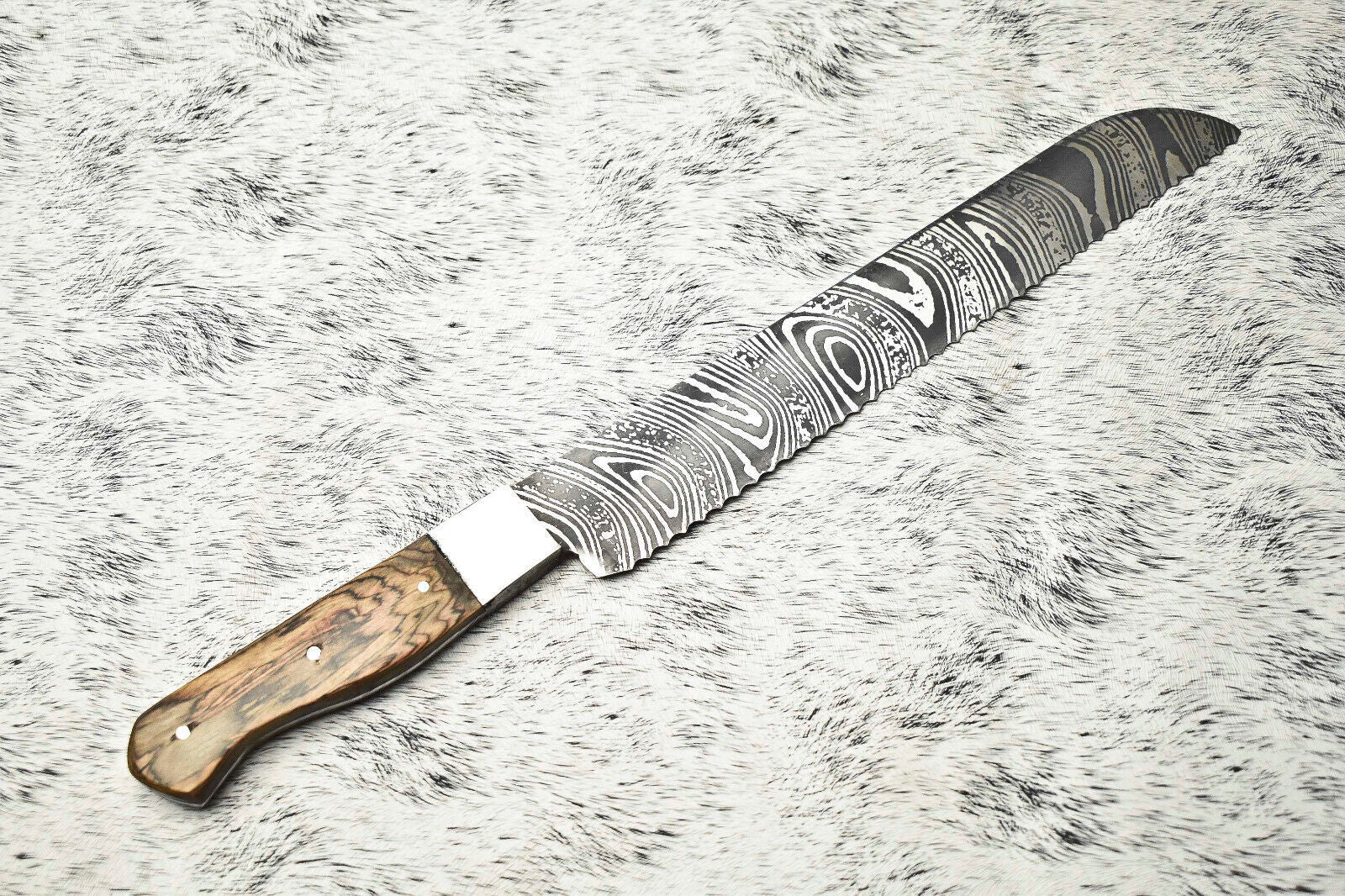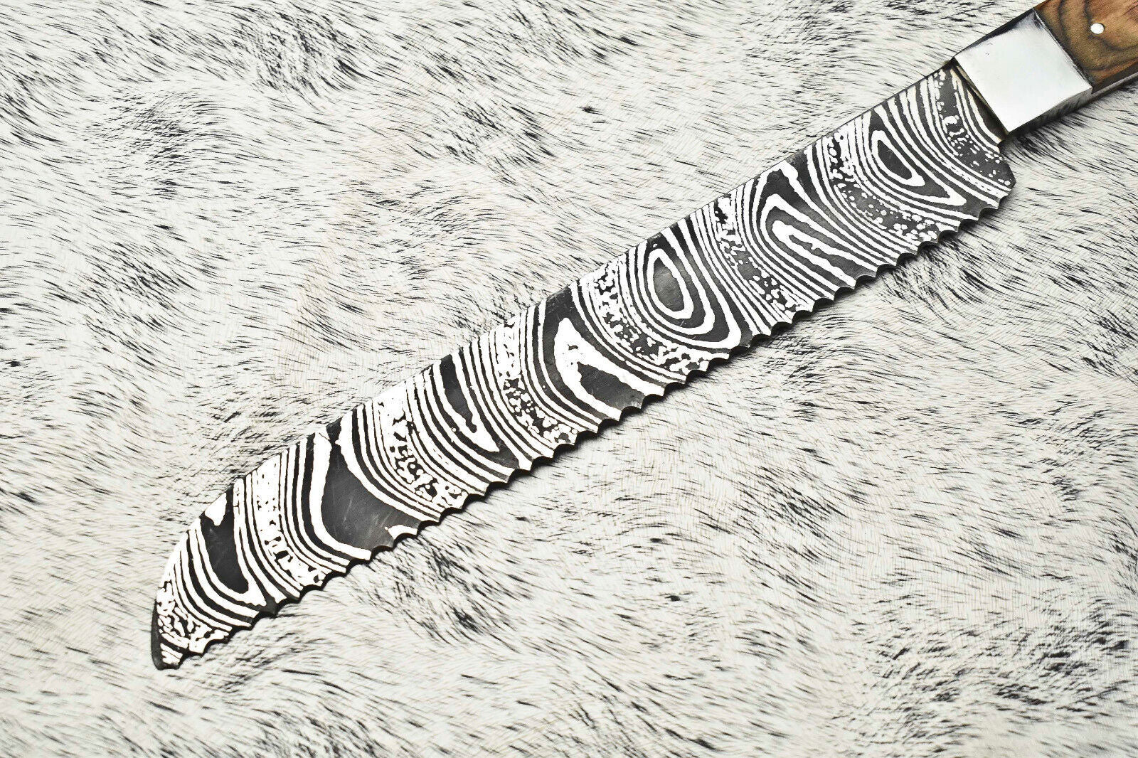 The Cutlery Salvation Handmade Damascus Blade Kitchen Full Tang Chef Knife is a premium, hand-forged culinary masterpiece designed for professional chefs and cooking enthusiasts alike. Measuring an impressive 14 inches in overall length, this knife is oil tempered to a Rockwell hardness of 58–60 HRC and features a razor-sharp edge honed at 20 degrees for superior cutting performance. Crafted from a genuine Damascus steel blend of 1095 high-carbon and 15N20 nickel carbon steel, the blade undergoes a meticulous forging process in which the metals are repeatedly heated and folded to create 384 stunning layers. After forging, the blade is acid-etched, transforming the nickel into a satin silver hue and the high-carbon steel into a rich blackish-gray, revealing the striking Damascus pattern. The full tang design ensures perfect balance and lasting durability, while the polished handle offers comfort and control. Every knife is hand-finished, with the exact piece shown in the photographs being the one you will receive—guaranteeing a unique, functional work of art for your kitchen.