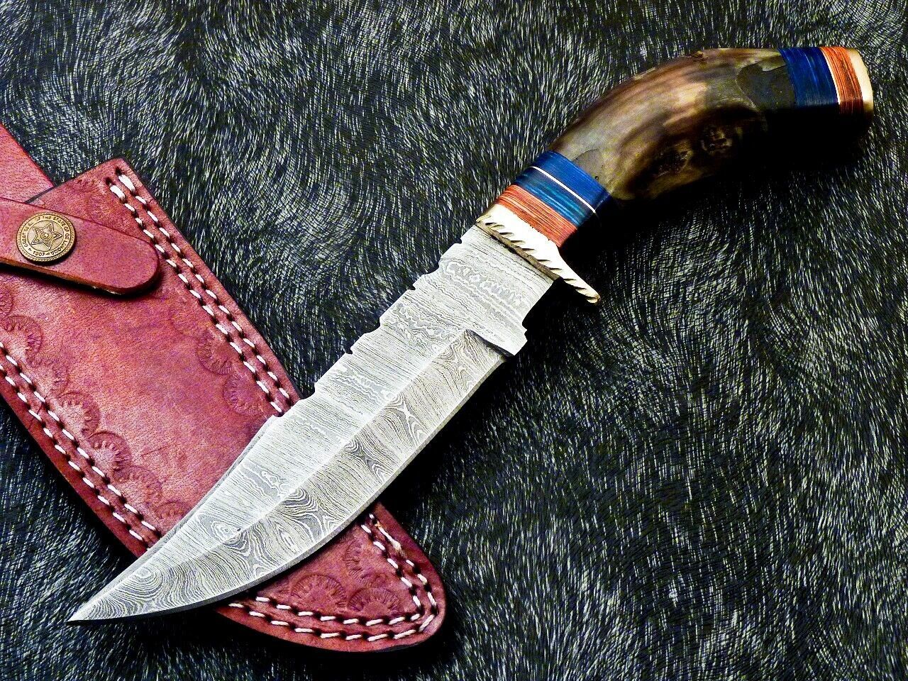 Damascus Bowie – 10" Handmade Ram Horn & Hardwood Handle with Leather Sheath