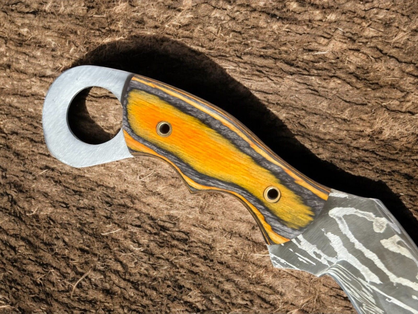 The 5 inch blade is forged from high quality karambit damascus steel, known for its cutting reliability. Its curved profile improves slicing precision, making it a versatile damascus steel knife for outdoor tasks.Built for field use, it qualifies as a strong best damascus hunting knife option for serious outdoor enthusiasts.