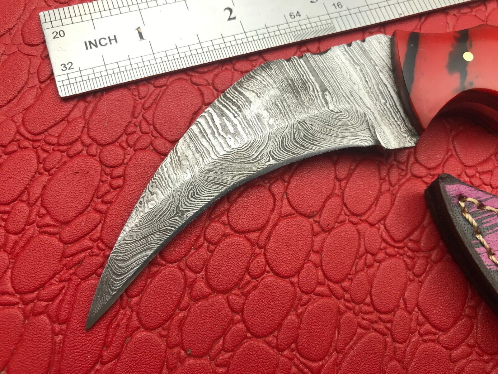 - Curved damascus steel karambit blade for improved slicing precision