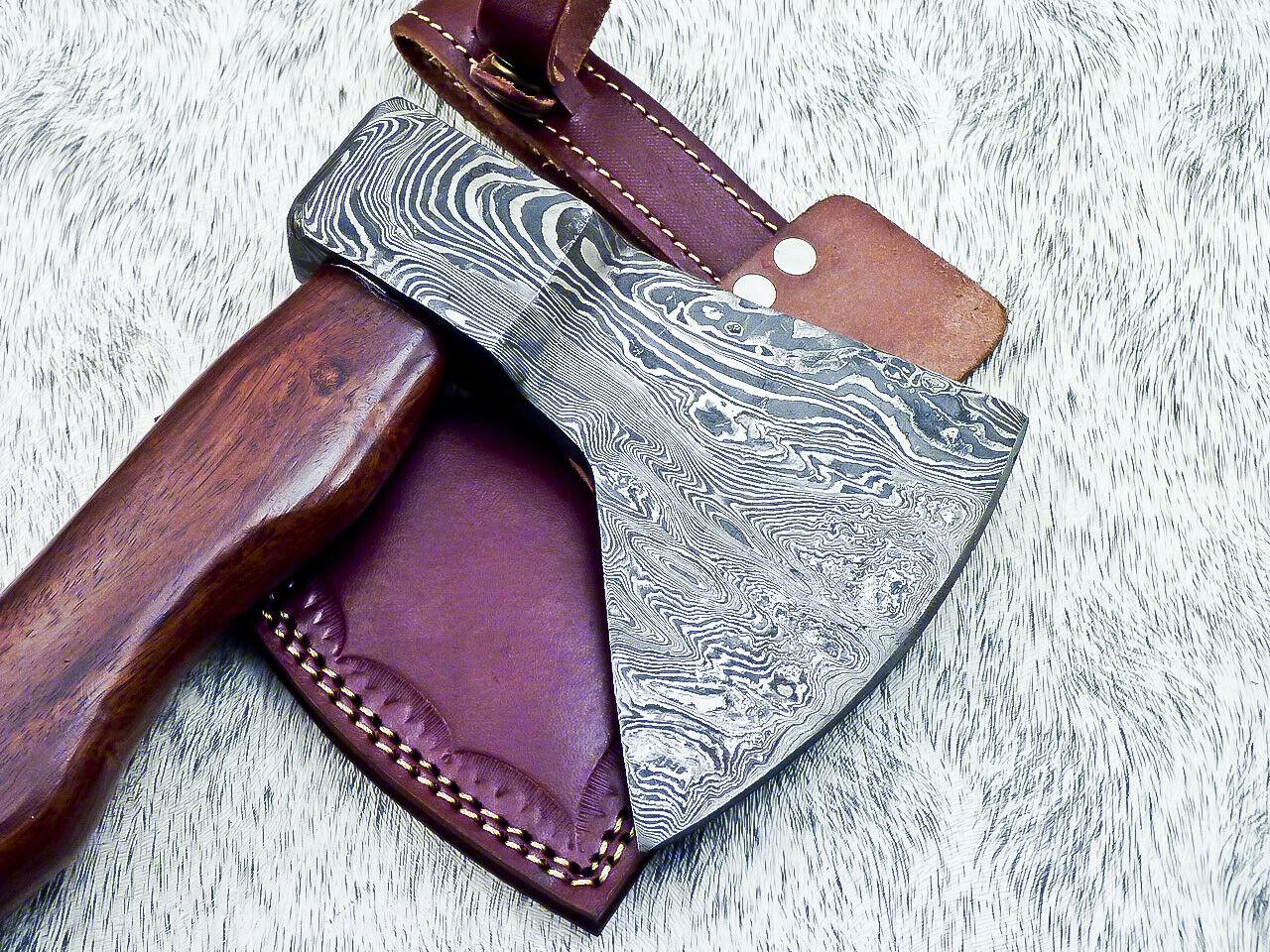Damascus Steel Axe – Limited Edition Custom Forged Battle Axe with Natural Wood Handle and Leather Sheath