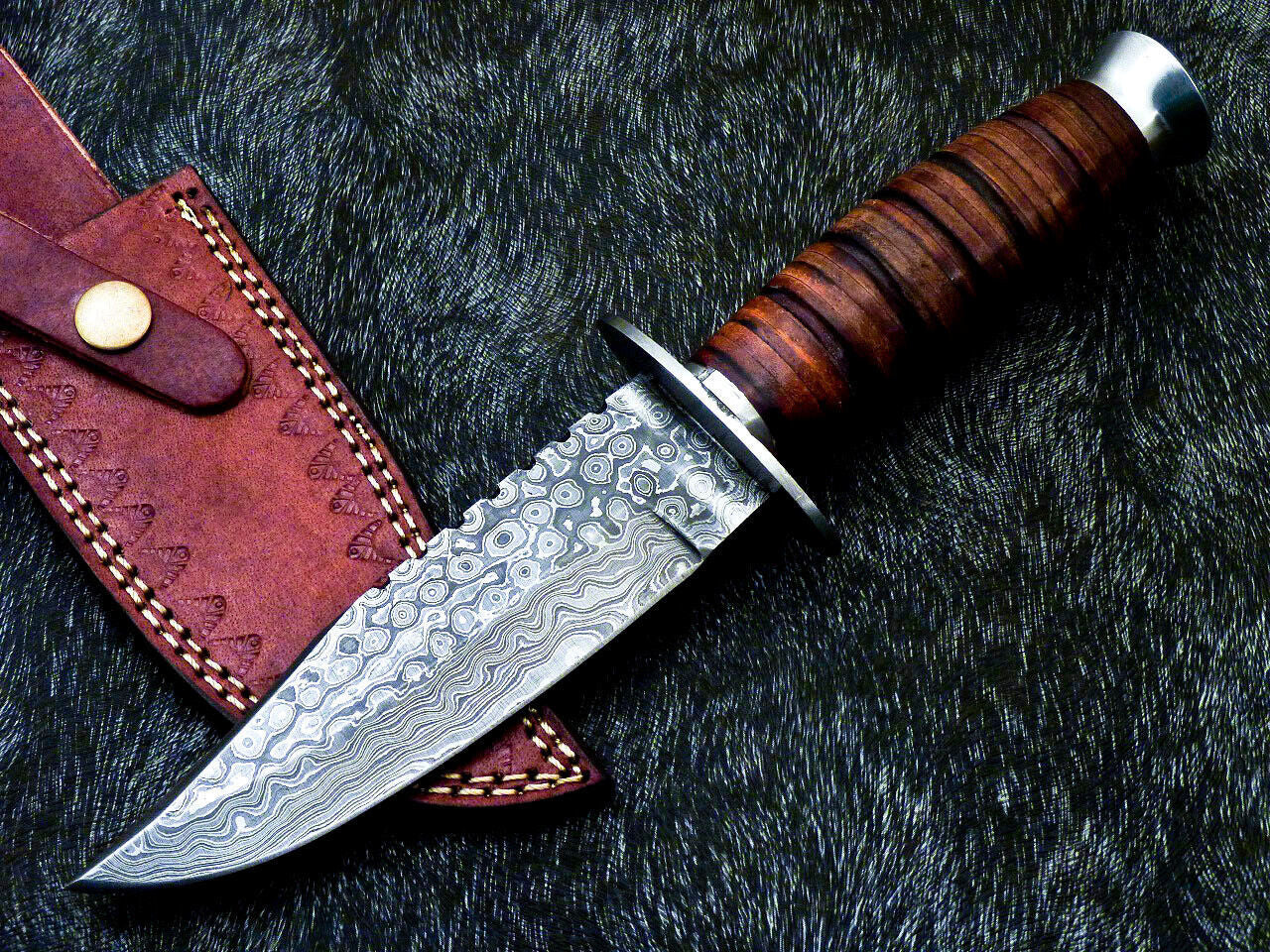 Damascus Steel Bowie Knife – 10 Inch Handmade Hunting Blade with Leather Handle