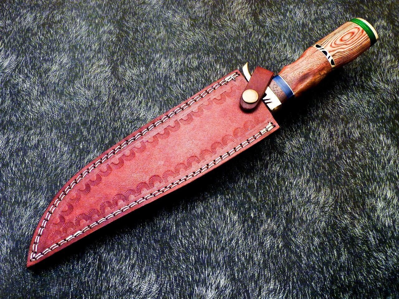 Damascus Steel Bowie Knife – 14.5 Inch Handmade Hunting Blade with Hardwood Handle