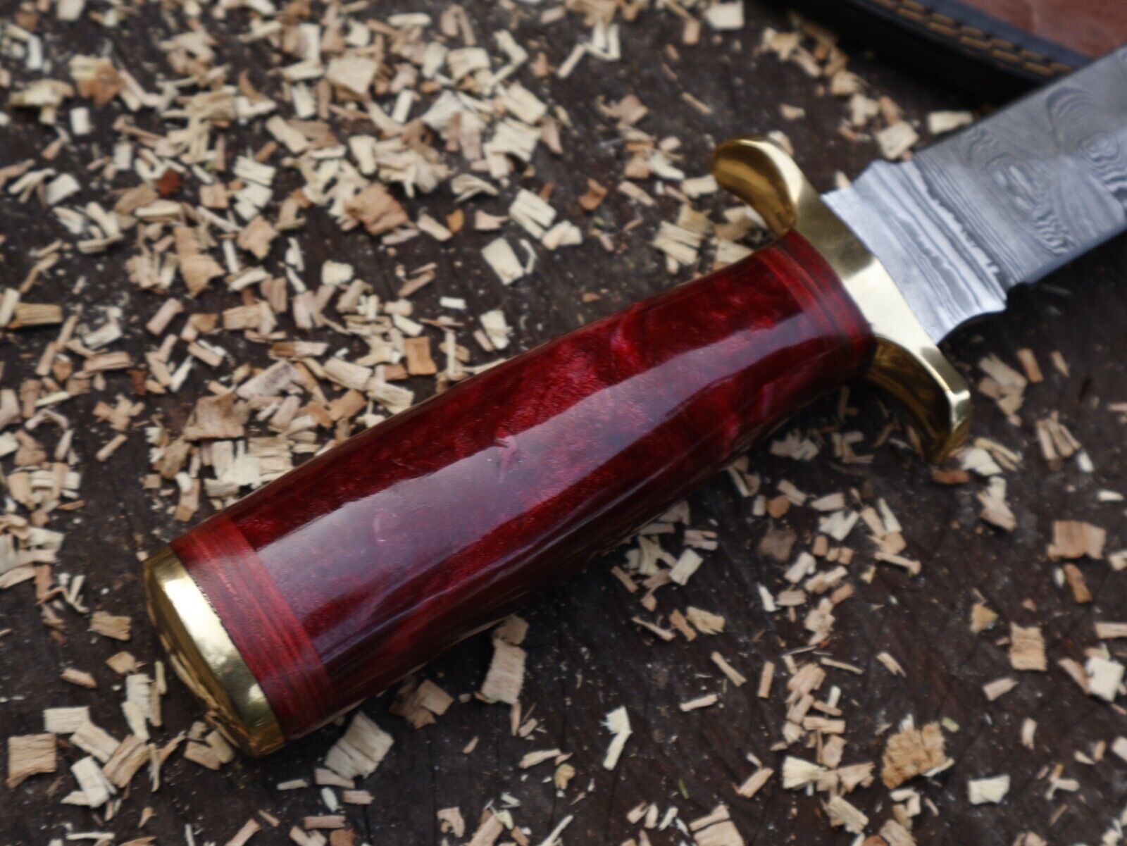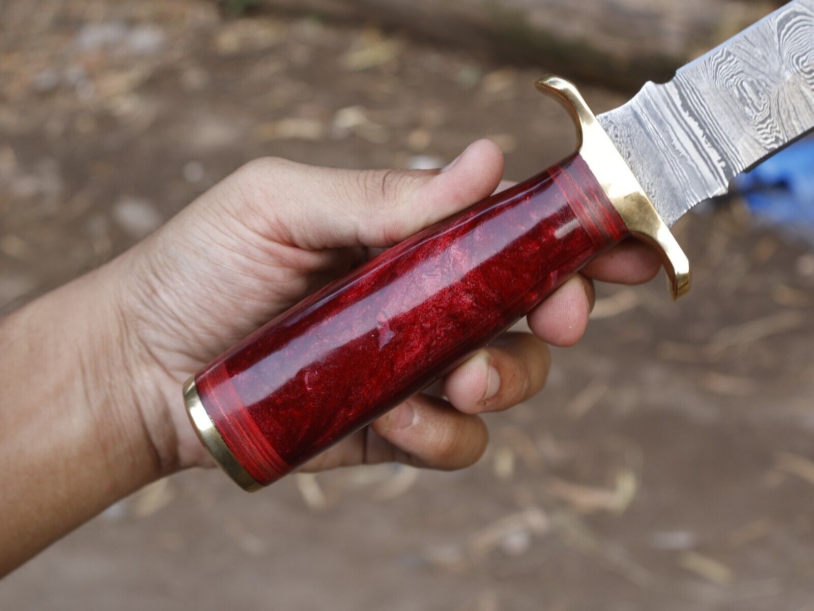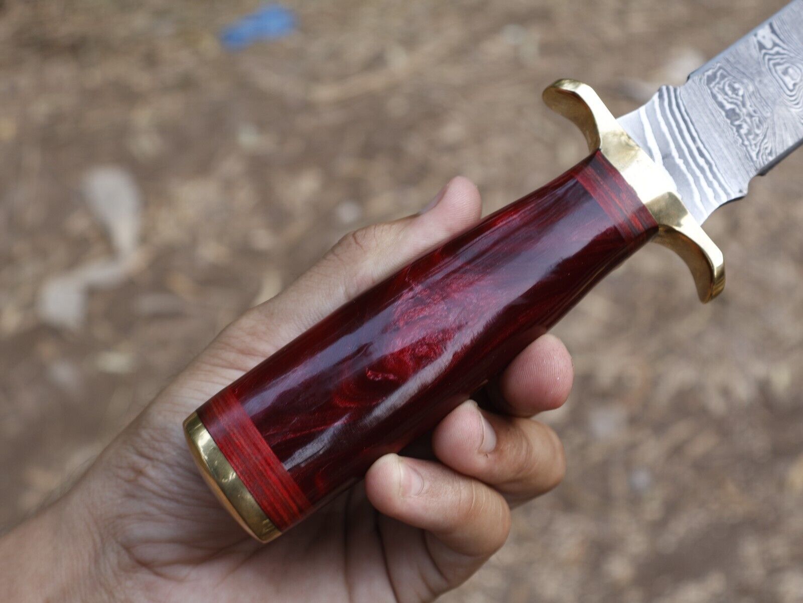 Damascus Steel Bowie Knife Resin Hardwood Handle Camping Dagger