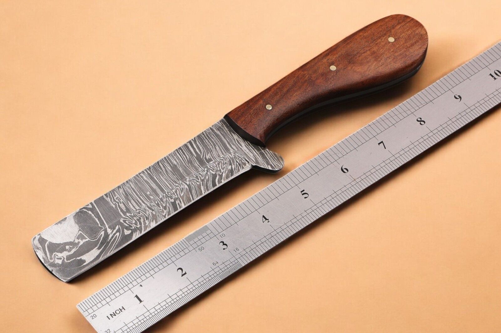 The blade is crafted from Damascus steel with an approximate thickness of 4 mm, providing cutting stability.This construction makes it a dependable option for those seeking the best bull cutter knife, a reliable alternative to calf cutter knives, or a trusted best hunting knife for outdoor tasks.