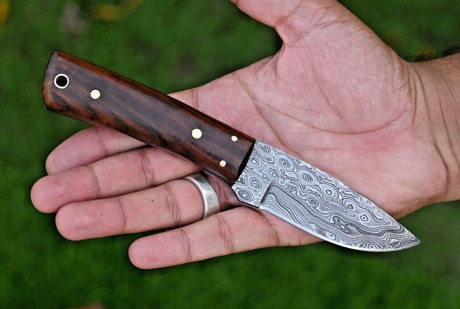 This handmade Damascus steel skinning and hunting knife offers exceptional performance, durability, and craftsmanship in a compact everyday carry design. Measuring 7.5 inches overall, it features a 4-inch raindrop-pattern Damascus blade, hand-forged from 512 layers of 4340 stainless steel and 1075 high-carbon steel. Heat-treated to a hardness of 55–58 HRC, the blade provides razor-sharp cutting capability, excellent edge retention, and striking visual appeal. The handle, crafted from premium hardwood, measures 3.5 inches and is shaped for a secure, comfortable grip—perfect for precision control during hunting, skinning, or outdoor tasks. This knife is rigorously tested under demanding conditions to ensure balance, durability, and reliability. The included hand-stitched leather sheath offers safe storage, easy access, and lasting protection, making it ideal for outdoor adventures, camping, or everyday carry. Combining a functional EDC size with traditional Damascus artistry, this skinner knife is built for both performance and style.
