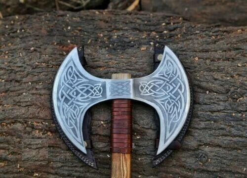 This Double Headed Viking Battle Axe is a striking piece of craftsmanship, hand forged with precision from high-quality carbon steel. Designed for strength and durability, the dual blades offer both functionality and an impressive display of traditional Norse weaponry. With a total length of 24 inches, the axe is built for power, balance, and versatility, making it suitable for collectors, reenactors, and outdoor enthusiasts.