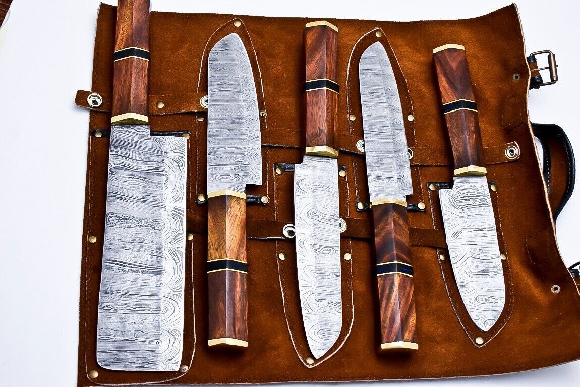 Entire World Handmade Damascus Chef Knife Set – Lot of 5 Kitchen Knives with Wood Handles & Leather Sheath