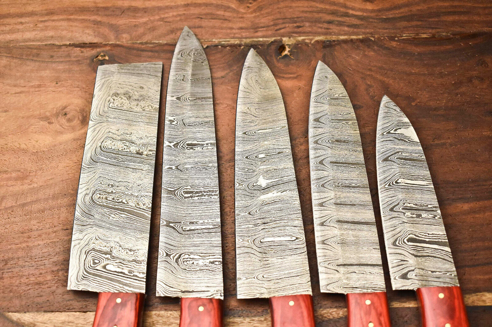 This custom lot of 5 handmade hammered Damascus steel blade chef set knives showcases exquisite craftsmanship and superior quality. Our Damascus steel is authentic and not just an acid etch; it is made by combining 1095HC and 15N20 nickel carbon steels. These metals are heated and folded repeatedly to create a stunning 384-layer pattern. The blades are then acid-burned, turning the nickel satin-colored and the high carbon steel blackish gray, revealing the unique Damascus layers. The knives are carefully high polished, which buffs off the acid burn on the handles while sharpening the blade edges to a satin finish. Each knife in this set is 100% handmade with no CNC machining involved, ensuring you receive a truly artisan product built for durability and precision.