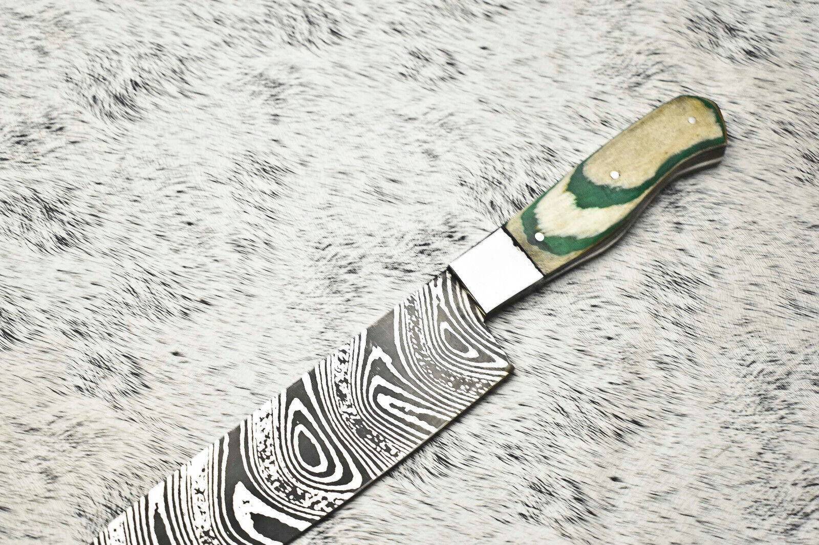 Each knife is hand-polished, and the edge is professionally sharpened for immediate use. The acid-etched Damascus pattern remains prominent on the flat of the blade, while the sharpened edge becomes satin-smooth. Every detail, from the forging to the polishing, is handled by skilled artisans.This knife includes a premium-quality cowhide leather sheath, as seen in the listing photos, for safe storage and a touch of elegance. Whether you're a chef, collector, or outdoor enthusiast, this versatile knife performs exceptionally in both kitchen and field use.