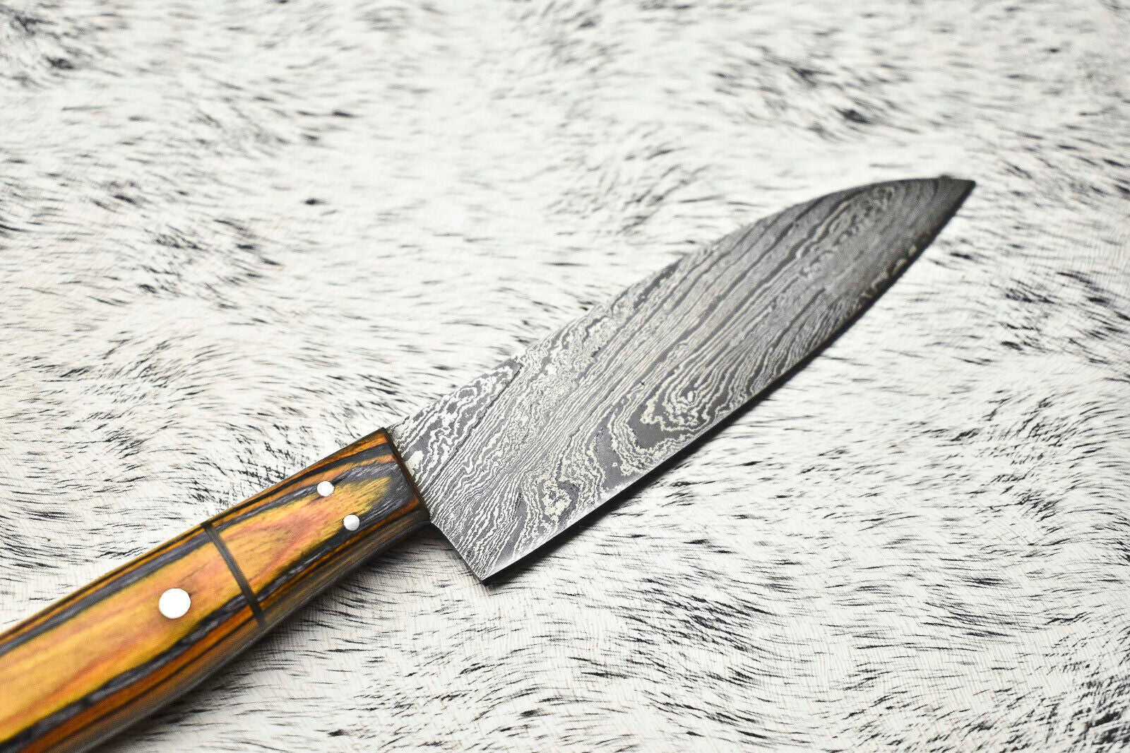 This fine custom handmade Damascus steel chef knife features an overall length of 10.0 inches with a 5.0-inch blade and a 5.0-inch handle. The blade is oil-tempered to 58-60 HRC and sharpened precisely at a 20-degree angle for superior cutting performance. Crafted from authentic Damascus steel made by folding 1095HC and 15N20 nickel carbon steel 384 times, the blade reveals beautiful layers through acid etching that expose the distinct nickel satin and blackish-gray high carbon patterns. The handle is high polished to a smooth finish, and the blade edge retains a sharp satin look. This full tang sport knife also includes a high-quality cowhide leather sheath for safe storage and transport. Every knife is 100% handmade with meticulous craftsmanship, perfect for chefs and outdoor enthusiasts alike.