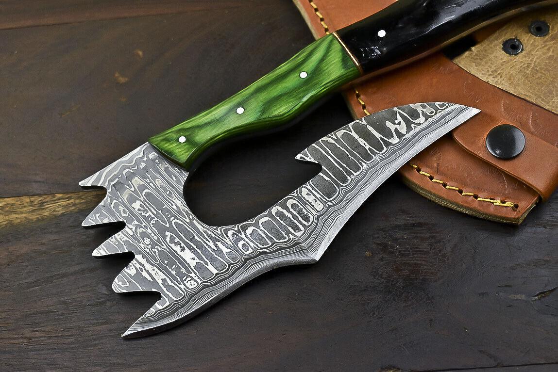 This Fixed Blade Damascus Steel Ram's Horn Clever Chopper Axe Knife is a masterfully crafted tool for collectors and outdoor enthusiasts alike. Handmade with a robust combination of 1095 and 15N20 high-carbon steel, the blade is folded multiple times to create exceptional strength and intricate Damascus patterns. Oil-tempered to 58–60 HRC and sharpened at 20 degrees, it provides remarkable edge retention, toughness, and precision for chopping, hunting, or survival tasks.