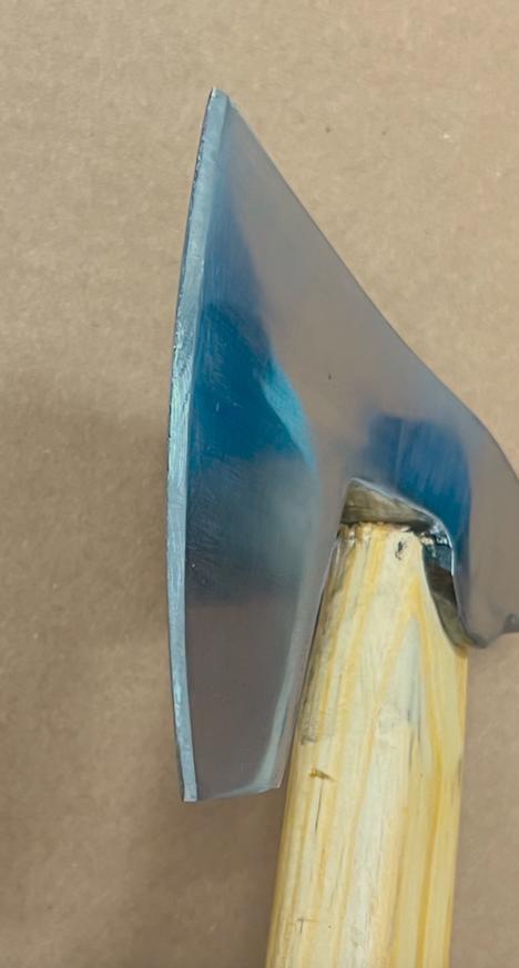 This axe has been tested on wood, rubber, and metal, proving its strength and reliability on a variety of materials. Its balanced design and robust construction make it both a functional tool and a striking collectible piece. The blade itself is approximately 5 inches long, with an axe head width of around 6 inches and a flat end measuring roughly 1.25 inches.