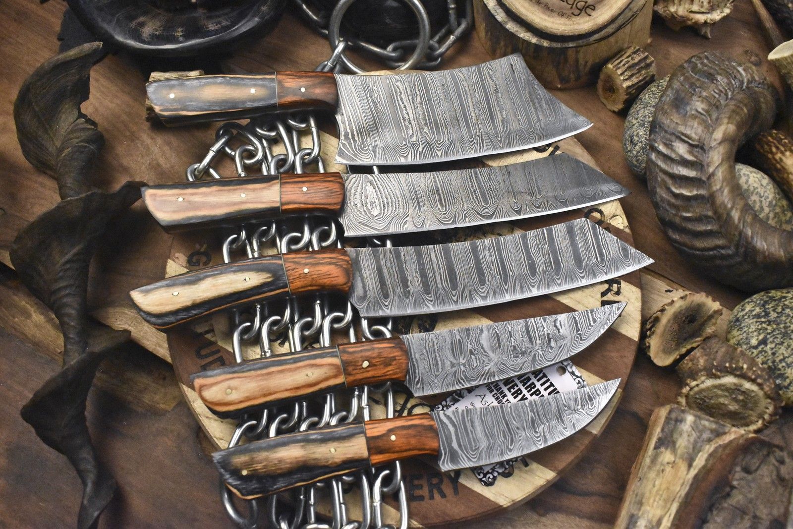 Forged Chef Knife Set – Twist Damascus Steel with Hardwood Handles, Lot of 5