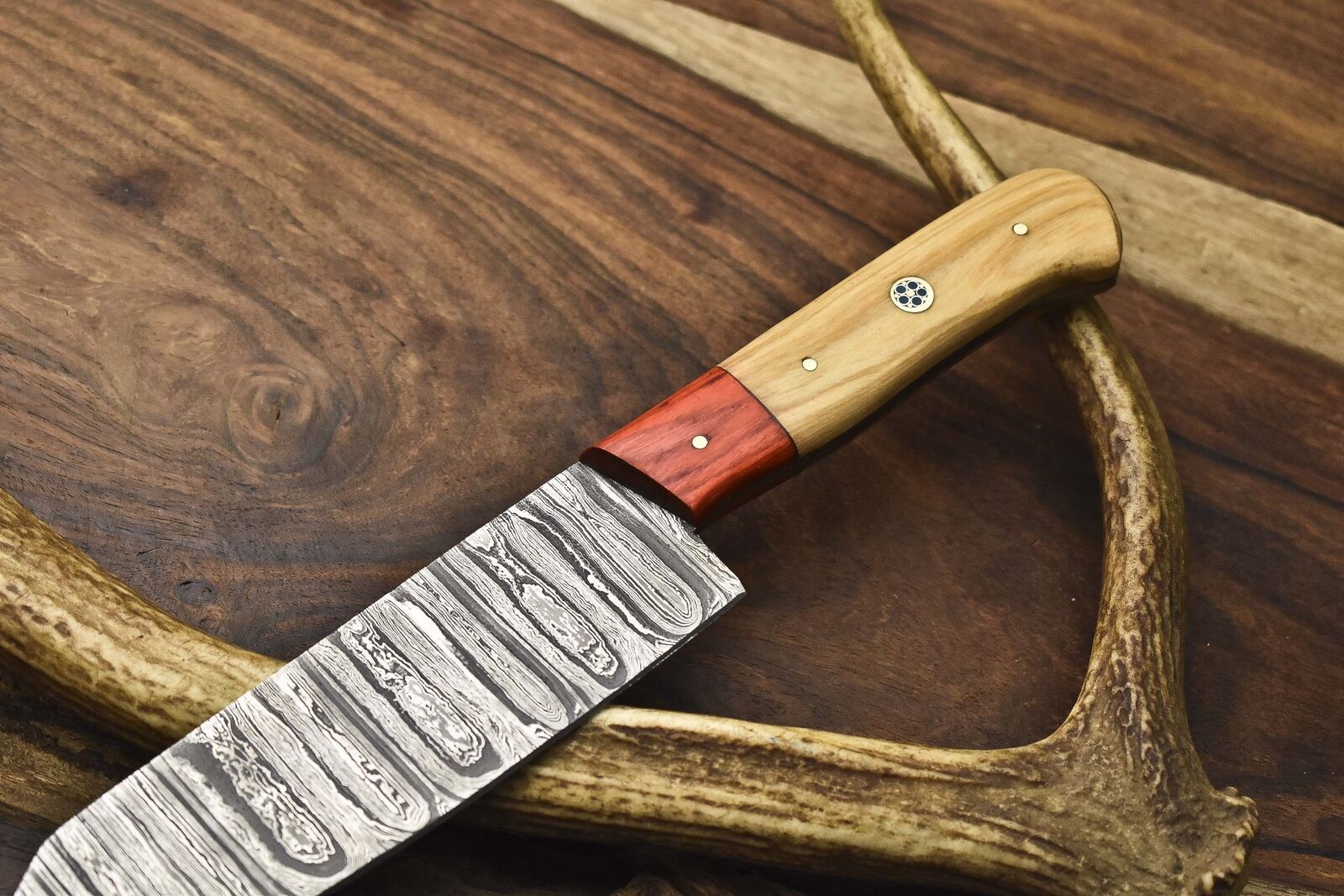 This Forged Chef Knife is a true collectible piece, crafted from premium twist-pattern Damascus steel and featuring a beautiful olive wood handle with a wooden bolster. Measuring approximately 11 inches overall, with a 6-inch blade and a 5-inch handle, this knife is oil tempered to 58–60 HRC, ensuring exceptional durability and sharpness. The blade is forged from a combination of 1095 and 15N20 steels, repeatedly folded to create striking layers that not only enhance strength but also form a unique and mesmerizing twist pattern. The swirling lines across the steel give the knife an elegant sense of motion and artistry, making it both functional and decorative. The olive wood handle provides a comfortable grip and natural beauty, while the wooden bolster adds balance and refinement. This chef knife is perfect for collectors, chefs, or anyone who appreciates fine craftsmanship. Please note: the listing does not include a leather sheath, but one can be purchased separately if required.