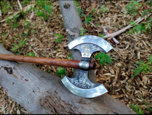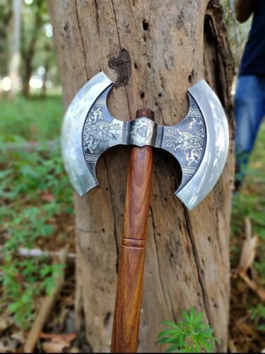 The wooden handle is ergonomically designed for comfortable handling, making it suitable for both left- and right-handed users. Finished with a silver-tone and classic Viking styling, this steel double blade Viking axe is as visually striking as it is practical. A custom leather sheath is included to protect the blades and allow safe transport. Made in Pakistan with meticulous attention to detail, this hand forged Viking axe embodies historical authenticity while serving as a reliable tool or collectible.