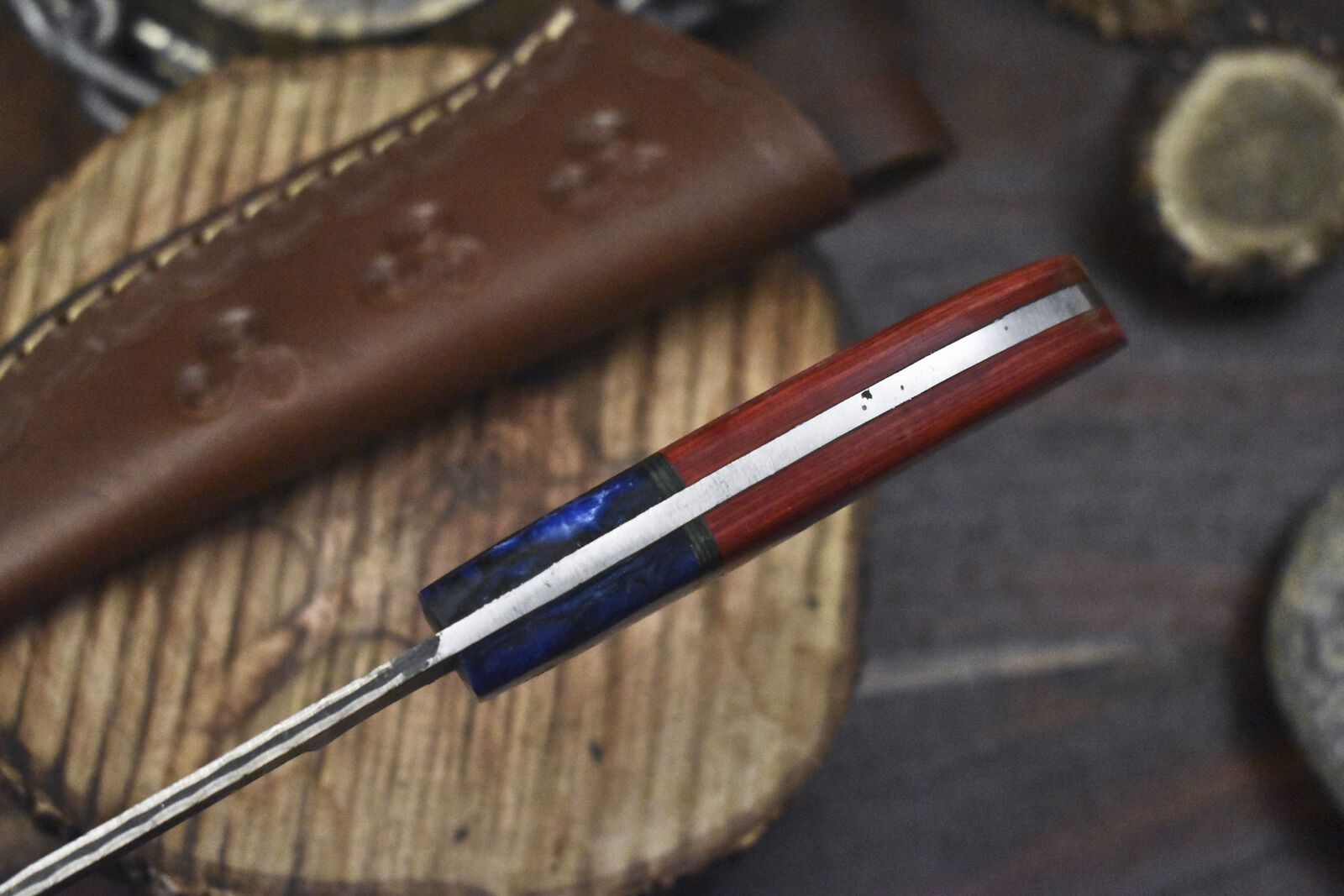 This forged skinner knife is a masterfully crafted tool designed for precision, durability, and aesthetic appeal. Featuring a bold ladder Damascus pattern on the blade and a sleek hard wood handle, this knife brings both performance and elegance to your hunting or outdoor kit. The 8-inch knife includes a 4-inch Damascus steel blade, oil tempered to 58–60 HRC, ensuring long-lasting sharpness and strength.