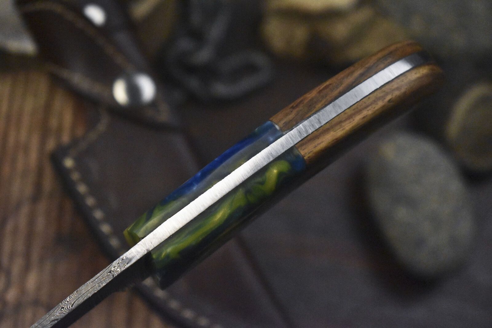 The gut hook design ensures clean, safe, and controlled skinning of game, while the micarta bolster adds structural strength and elegance. The layered 1095 and 15N20 steel construction creates a visually stunning pattern and enhances the knife’s durability for long-term use. Whether you’re seeking a damascus acid etched fixed skinner knife, a walnut damascus skinner knife, or a custom handmade fixed blade hunting knife skinner, this tool stands out in both form and function.