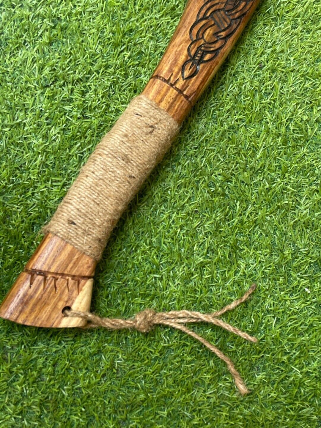 The axe features a multi-color wooden handle, ergonomically designed for a secure grip and visual appeal. Every detail reflects authentic Viking artistry, making it a standout piece for collectors and outdoor enthusiasts alike. This handmade hatchet comes with a durable leather sheath, combining practicality with historical elegance and bringing the spirit of the Vikings into modern-day adventures.