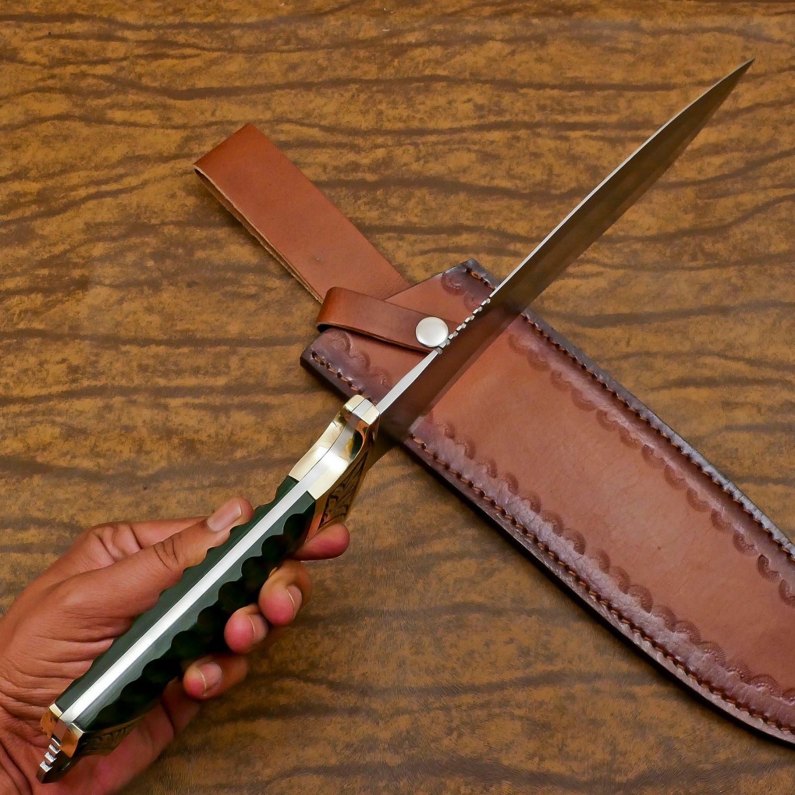 Experience the perfect combination of craftsmanship and performance with the Frontier 12-inch D2 steel full tang Bowie hunting knife featuring a premium Pakka wood handle. Designed for hunters, campers, survivalists, and collectors, this knife delivers strength, precision, and durability for all your outdoor adventures. The D2 tool steel blade is engineered for exceptional hardness, outstanding edge retention, and excellent wear resistance, making it ideal for chopping, slicing, piercing, and skinning during hunting trips, camping excursions, or survival missions. Its classic Bowie-style blade ensures versatile performance while presenting a bold, rugged aesthetic suitable for both functional use and display.The full tang construction provides maximum stability, balance, and toughness, allowing the knife to handle heavy-duty tasks with confidence. The ergonomically crafted Pakka wood handle offers a secure and comfortable grip, reducing hand fatigue during extended use while providing precise control for both delicate and forceful cutting tasks. Each knife is meticulously handcrafted by skilled artisans, giving it unique character and artisanal quality that distinguishes it from mass-produced alternatives. A custom leather sheath is included for safe storage and convenient portability, making this Bowie hunting knife ready for immediate outdoor use. Rugged, reliable, and expertly crafted, the Frontier 12-inch D2 steel full tang Bowie hunting knife with Pakka wood handle is a must-have for serious outdoor enthusiasts and collectors.