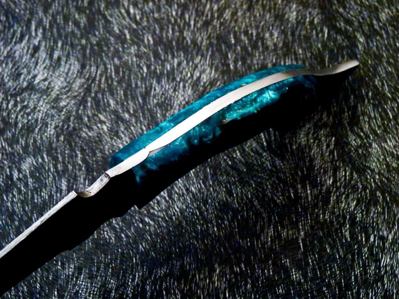 The knife is built on a full tang construction, ensuring durability and balance. The handle is crafted from resin scales, securely pinned with brass rivets and bonded with industrial epoxy for lifetime resilience. A bold finger ring design allows superior grip and control, ideal for combat scenarios or precision field tasks.