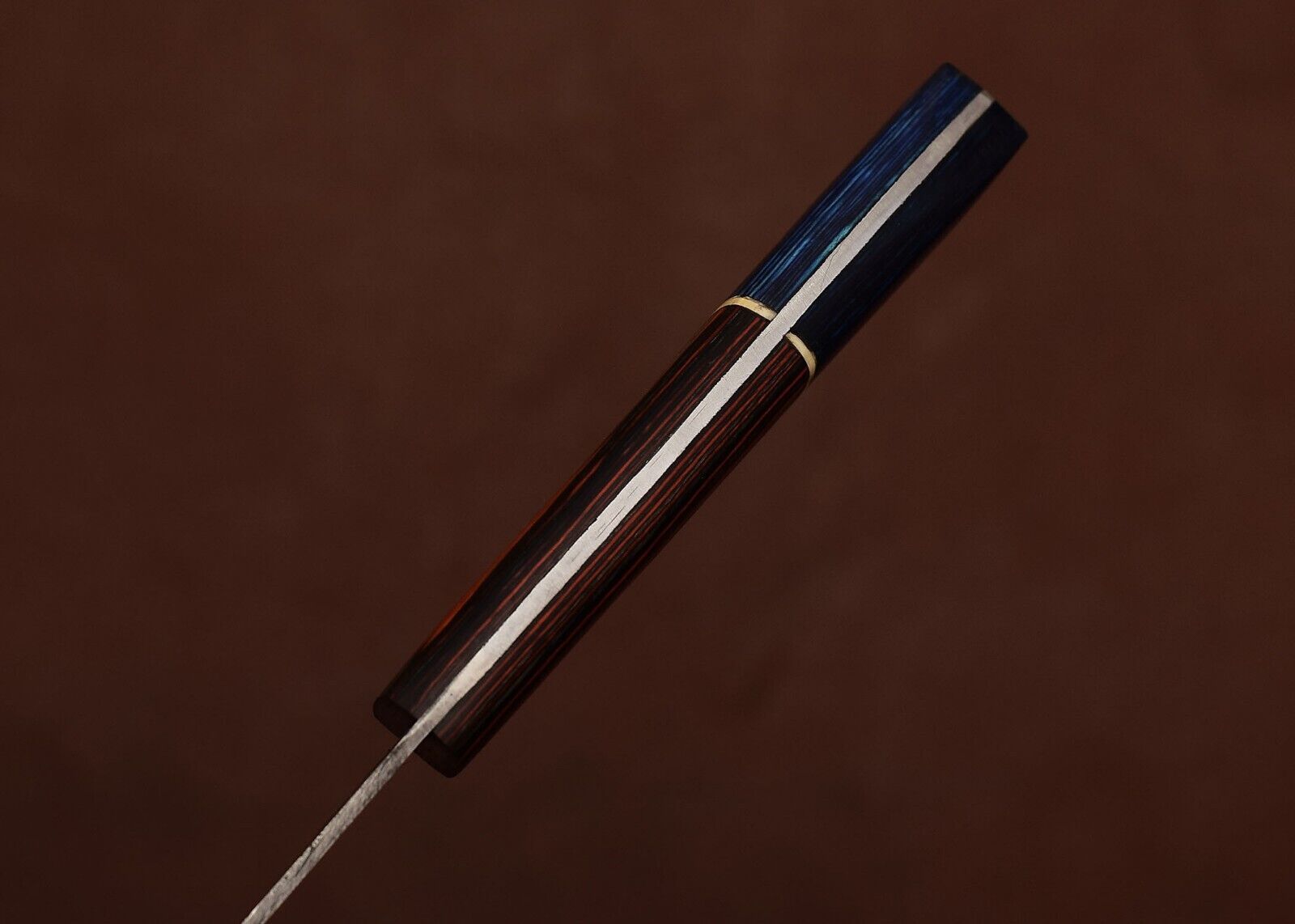 This Custom Handmade Damascus Steel Chef Fillet Knife is a perfect blend of durability, elegance, and functionality. The razor-sharp 8-inch Damascus Steel blade is designed with a straight edge for precision cutting, slicing, and filleting. Crafted with a sturdy 5-inch Pakka Wood handle and wood bolster, it provides a secure and comfortable grip, making it ideal for long cooking sessions. The full tang design ensures strength and balance.
