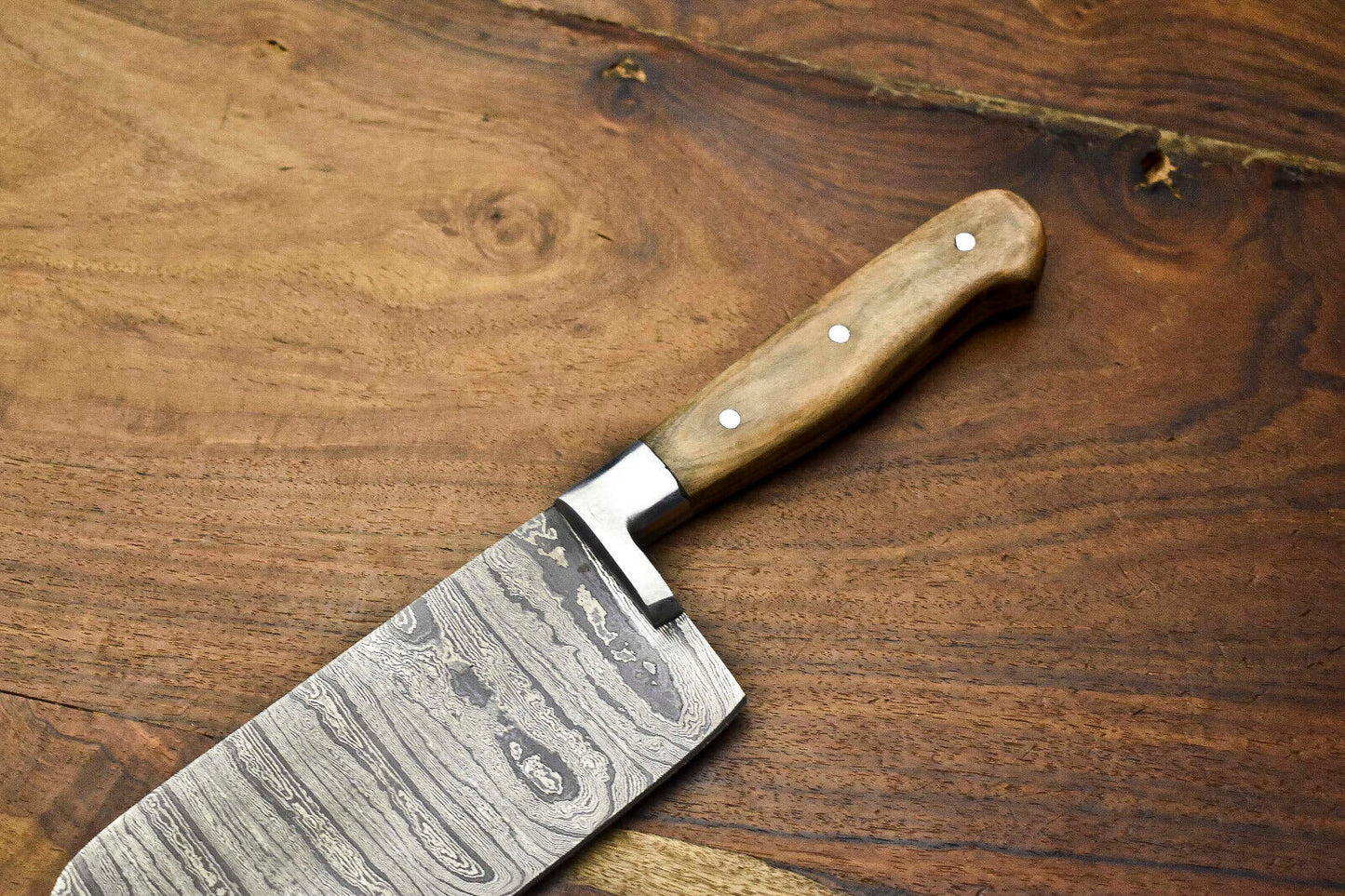 This custom handmade Damascus steel chef knife features a beautifully forged blade made from 384 layers of 1095 high carbon steel and 15N20 nickel carbon steel, folded repeatedly to create a strong, durable, and visually stunning Damascus pattern. Unlike simple acid-etched blades, our Damascus steel is authentic, forged metal with an acid burn that reveals the nickel’s satin silver color and the high carbon steel’s deep black-gray tone, exposing the characteristic layered pattern. The full tang construction ensures exceptional balance, strength, and control, ideal for both professional kitchen use and outdoor sport applications. Each handle is carefully high-polished to a smooth finish, complementing the blade’s sharp satin edge, sharpened precisely for razor-sharp cutting performance. This knife is perfect for chefs, collectors, hunters, and anyone who appreciates functional craftsmanship and unique artistry in their blades.
