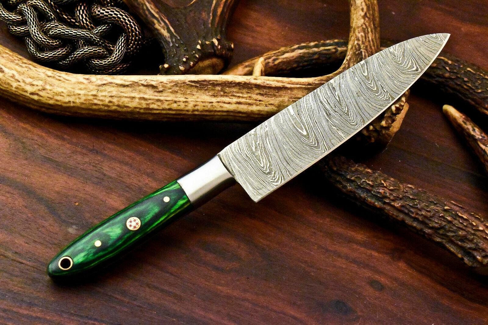 Elevate your collection with this gorgeous handmade Damascus steel chef hunting knife, crafted for performance, durability, and timeless beauty. Measuring 12 inches overall, this versatile knife features a 7-inch razor-sharp blade and a 5-inch full tang handle made from premium hardwood, polished for comfort and strength. Whether you’re preparing meals in the kitchen, camping outdoors, or using it as a reliable hunting companion, this knife is designed to excel in every task.The blade is forged from a blend of 1095 high carbon steel and 15N20 nickel steel, folded repeatedly to create 384 layers. This traditional forging method produces the stunning Damascus pattern while ensuring a strong, flexible, and sharp edge. Oil tempered to 58–60 HRC, the blade holds its sharpness for long-term use, while edges sharpened at 20 degrees deliver precision cutting.Each knife is entirely handmade by skilled artisans, ensuring no two pieces are exactly alike. The hardwood handle provides a secure grip, balanced weight, and lasting durability, making this knife as functional as it is beautiful. Perfect for chefs, hunters, campers, or collectors, this Damascus steel knife is more than just a tool — it’s a work of art built to stand the test of time.