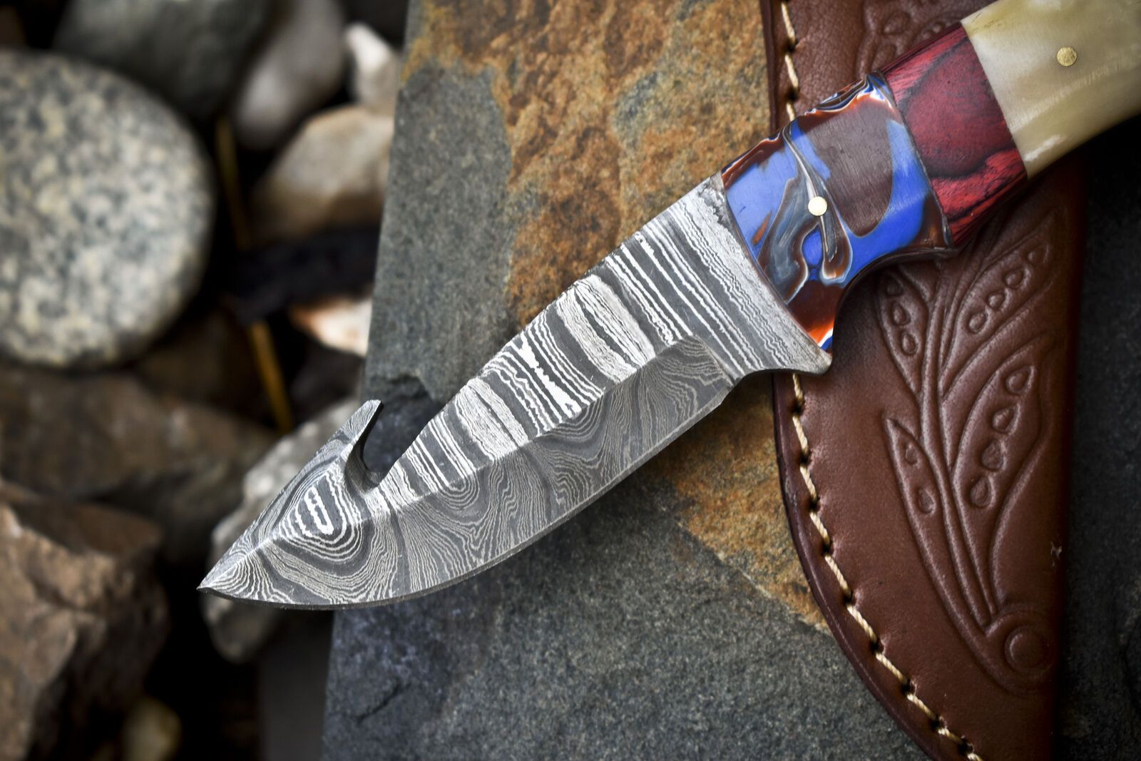 Experience unmatched craftsmanship with this hand crafted damascus skinner knife, expertly designed for hunters, campers, and outdoor enthusiasts. This tactical knife features a 9-inch overall length with a 4.5-inch blade made of premium twist damascus skinner hunting knife steel, tempered to 58-60 HRC for exceptional edge retention and durability. The gut hook provides precise, safe, and efficient field dressing, making it a must-have tool for hunting and camping.