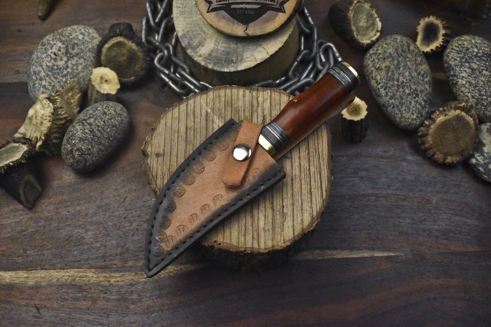 This hand crafted skinner knife with gut hook is a premium hunting and outdoor tool, expertly forged from high-quality twist pattern Damascus steel, combining 1095 and 15N20 for superior strength and edge retention. The overall length is approximately 8.0 inches, with a 4.0-inch razor-sharp blade and a 4.0-inch Corain handle, providing a comfortable and secure grip during use. Designed for hunters, campers, and collectors, this skinner knife features a wide, short blade ideal for precise skinning tasks, while the integrated gut hook allows for controlled and efficient field dressing of game such as deer or elk. The Damascus twist pattern creates an eye-catching swirl of deep blacks and bright silvers, polished to a striking shine. This knife comes with a premium hand-tooled leather sheath for safe storage and transport, crafted for durability to withstand years of rugged use. Perfect as a functional hunting knife or as a unique collectible gift, this handmade Damascus skinner is both practical and visually stunning.