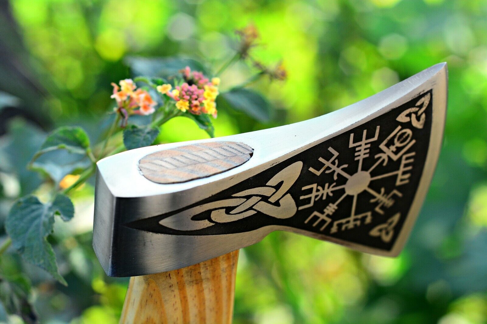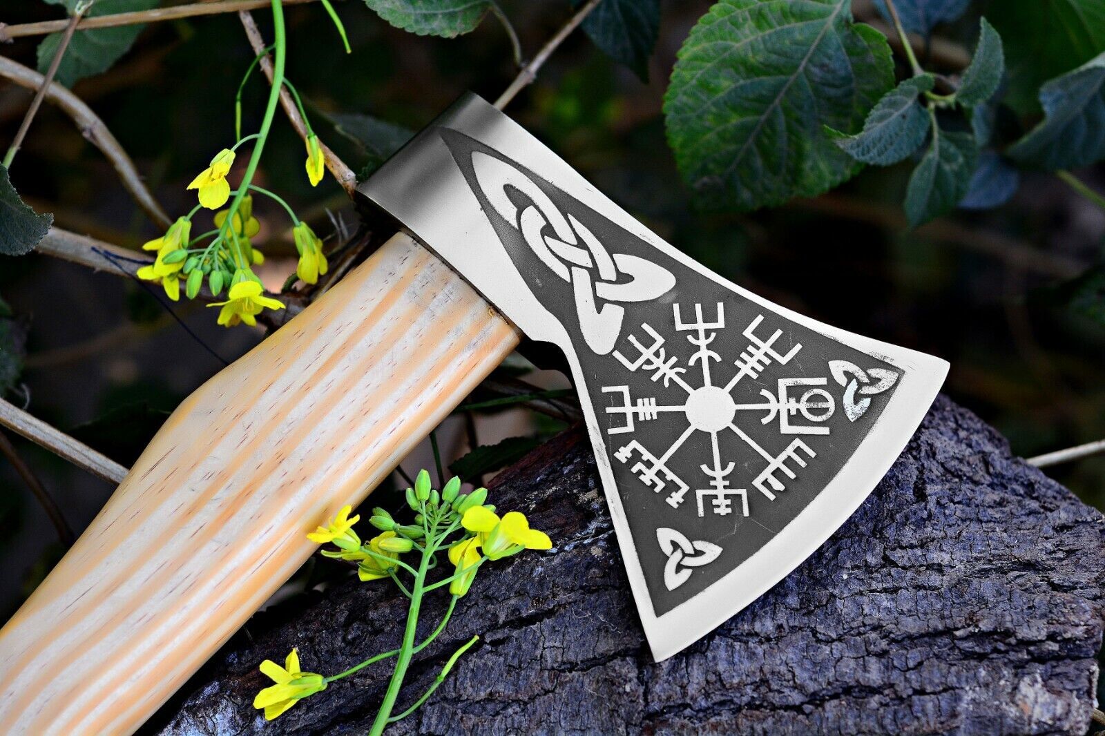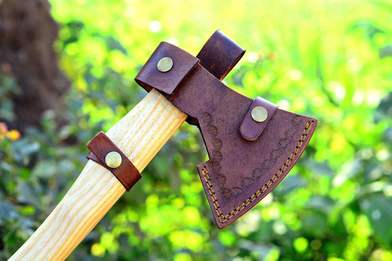 This hand forged Viking tomahawk is crafted from high-quality 1095 carbon steel, designed for strength, durability, and precision. Forged through hours of skilled craftsmanship, the blade has undergone excellent heat treatment, achieving a Rockwell hardness of 54 along the edge and 42–45 along the spine. This balance of toughness and edge retention makes it a reliable tool for outdoor tasks, hunting, and survival use.The axe measures 17 inches in overall length, with a 4-inch cutting edge and a 6-inch wide head. Its 4 mm thick blade is hand ground on both sides, with a refined false edge along the top for added versatility. The handle is made from premium olive wood, offering both strength and a comfortable, secure grip while showcasing its beautiful natural grain.To ensure safe storage and easy carrying, this tomahawk comes with a fine quality leather sheath. Perfect for camping, bushcraft, and outdoor adventures, this handmade axe combines functionality with traditional Viking-inspired design, making it an ideal tool and a collectible piece.