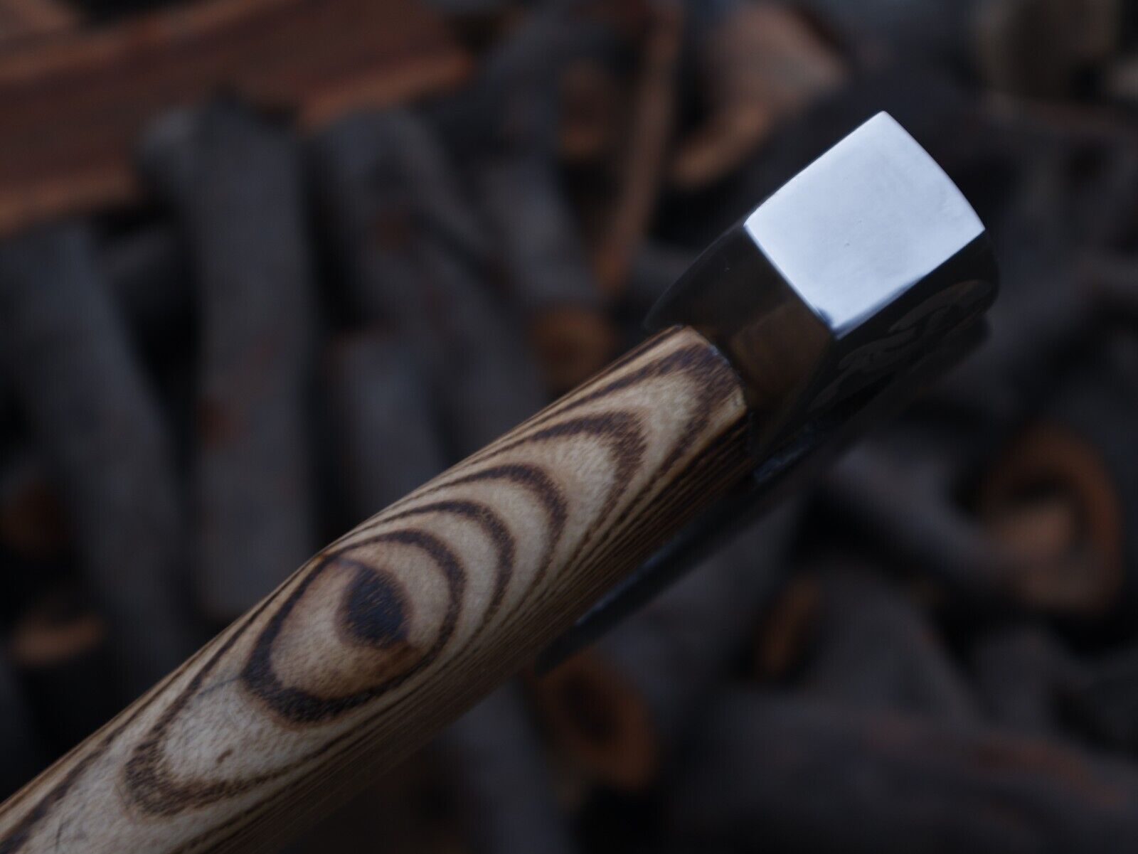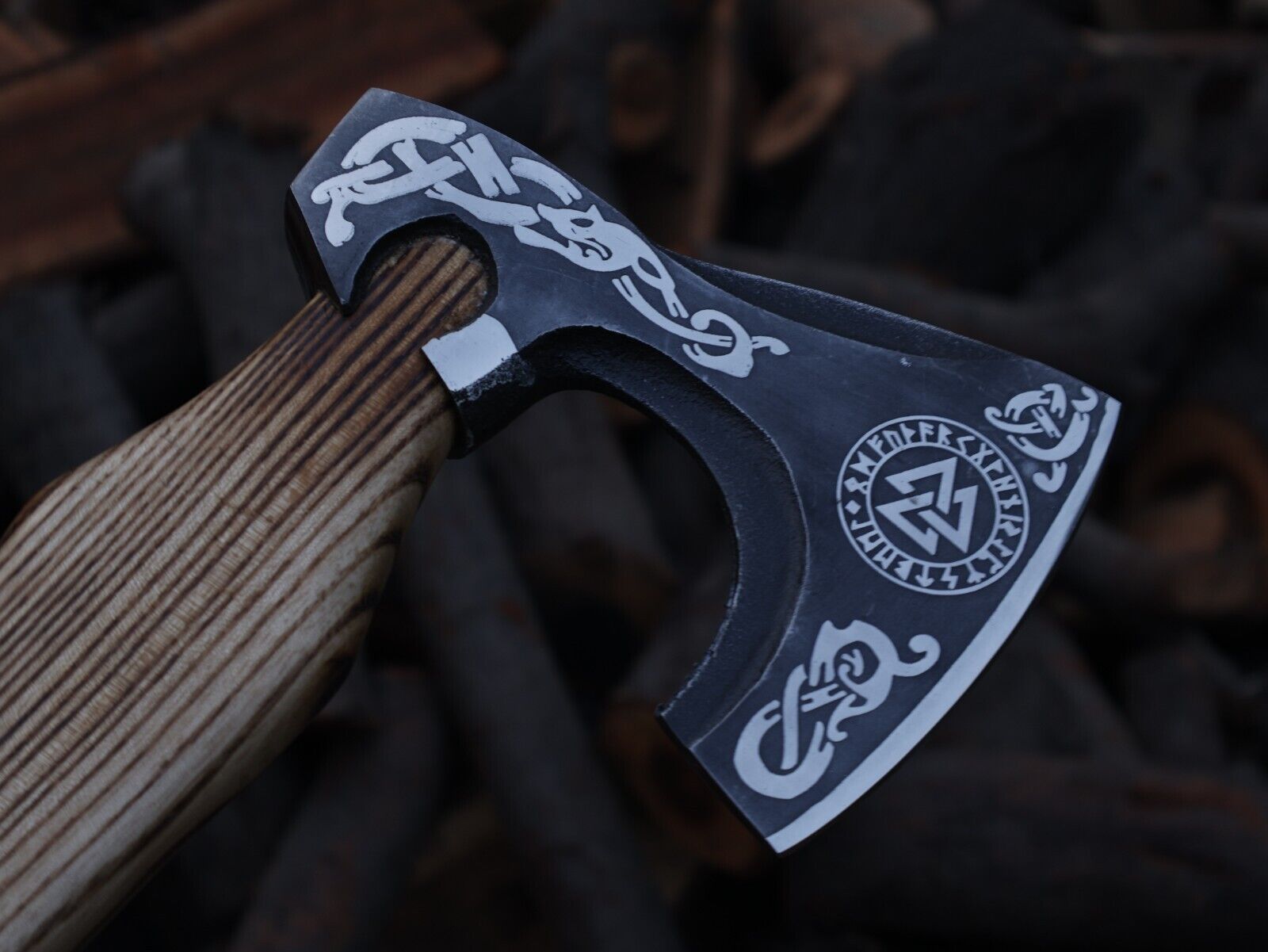 This hand forged Viking axe is a masterpiece of craftsmanship, designed for both function and display. Forged from durable carbon steel, the blade measures 4.5 inches with a width of 6.5 inches, offering excellent balance between strength and precision. The axe has an overall length of 18 inches, fitted with a sturdy ash wood handle that provides a comfortable, secure grip for chopping, throwing, or outdoor survival tasks.Crafted with over 270 layers of 1095 and 15N20 steel, this tomahawk axe has undergone superior heat treatment, achieving a Rockwell hardness of 56–57 HRC. The blade is sharp, resilient, and built to withstand heavy use, making it ideal for hunting, camping, or bushcraft.Every detail reflects authentic Norse-inspired artistry, from the etched blade to the engraved handle, making it both a functional tool and a striking collector’s item. This axe includes a hand-stitched leather sheath for safe storage and easy portability, ensuring long-lasting protection for the blade. Whether used as a Viking battle axe in outdoor adventures or displayed as a decorative piece, it combines tradition, durability, and beauty in one unique design.