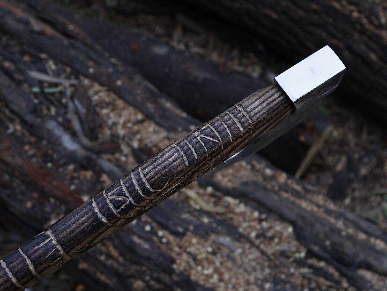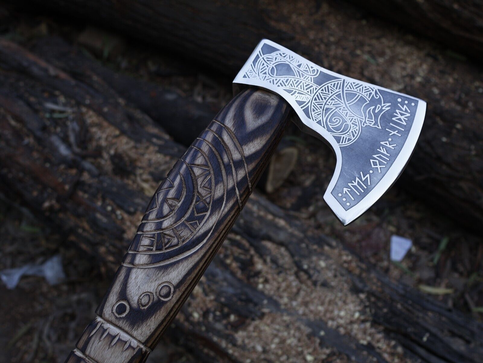 This hand forged Viking axe combines strength, craftsmanship, and traditional Norse-inspired design. Measuring 21 inches overall, with a 5-inch cutting edge and a 6-inch wide blade, this axe is built from durable carbon steel and designed to deliver both power and precision. The engraved ash wood handle not only enhances grip and comfort but also adds a striking artistic touch, making this piece as beautiful as it is functional.Forged with over 270 layers of 1095 and 15N20 high carbon tool steels, the blade undergoes expert heat treatment to reach a Rockwell hardness of 56–57 HRC. This process ensures excellent edge retention, toughness, and long-lasting durability, making the axe ideal for chopping, camping, bushcraft, or throwing.