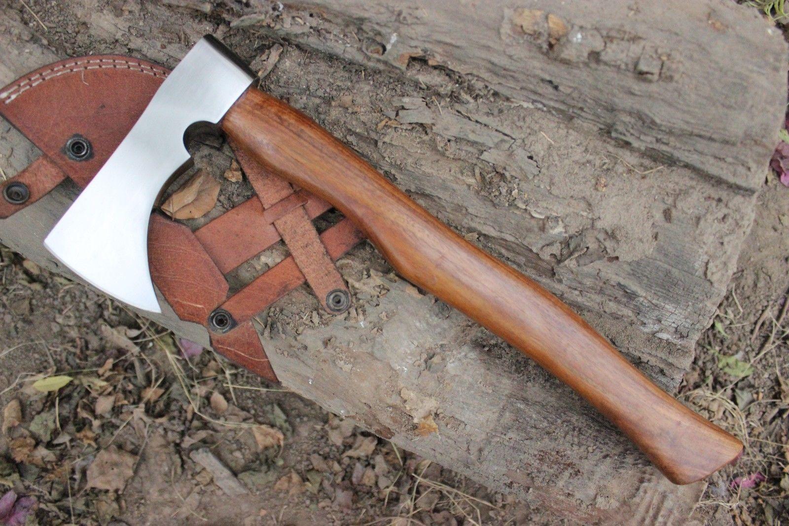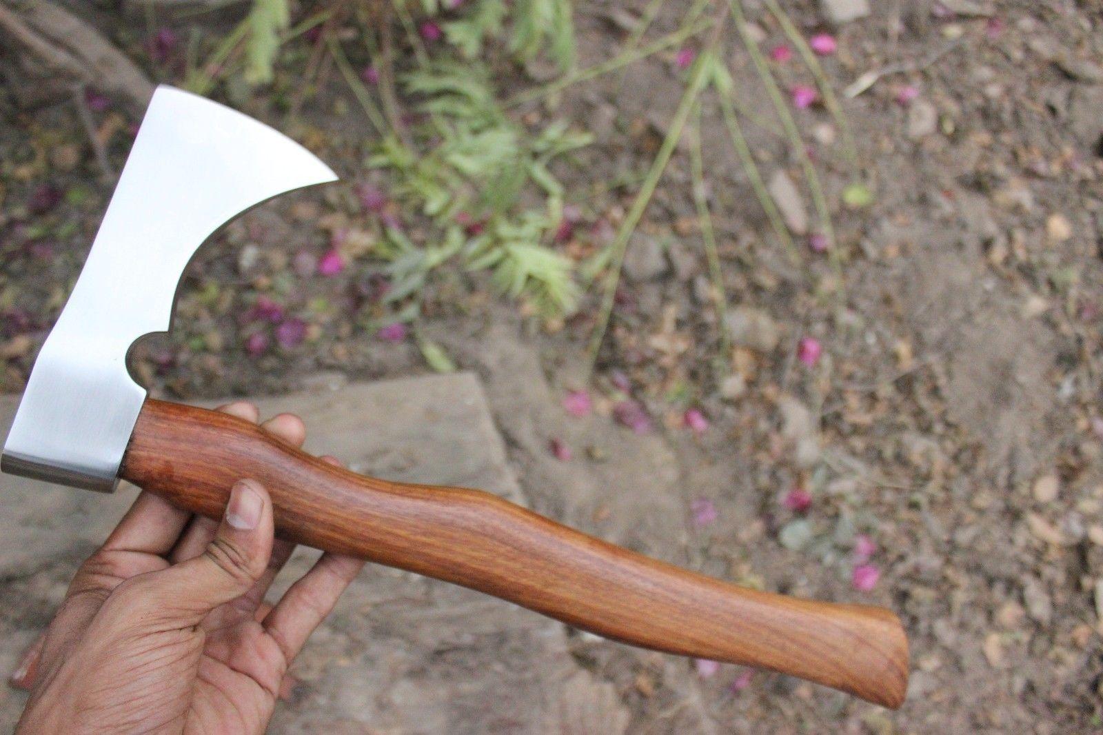 This hand forged Viking tactical tomahawk is crafted from 5160 high carbon steel, a material known for its incredible toughness and resilience. Measuring 16 inches overall, this axe features a 6-inch head with a 3-inch cutting edge, designed for both strength and precision. The blade is heat treated to a Rockwell hardness of 59 HRC, ensuring excellent durability and sharpness retention even under heavy use. The walnut wood handle provides a secure and comfortable grip, perfectly balancing the forged head while adding a natural, timeless aesthetic. With its drifted tear-drop eye, the head fits securely onto the handle, making it both functional and historically authentic. Each tomahawk is hand forged using traditional blacksmithing techniques, hammered on an anvil and finished by hand to ensure that every piece is unique. No two axes are ever exactly alike, giving you a one-of-a-kind creation. A leather sheath can be added for safe carry and display, making this tomahawk perfect for collectors, reenactors, or outdoorsmen. Whether for display, camping, or training, this Viking tactical grade tomahawk delivers exceptional performance and artistry. It is a piece built to withstand rugged use while honoring the heritage of Viking craftsmanship.