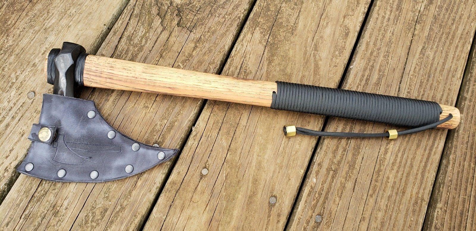 Crafted with precision and strength, this hand-forged Bearded Viking Camp Axe is built from solid 4140 chrome-moly steel, offering superior durability and impact resistance. Designed for both practical use and historical authenticity, this tomahawk features a distinctive bearded edge that provides excellent chopping performance, while the hammer poll on the reverse side adds versatility for striking tasks. Each head is normalized, hardened, and tempered to maximize strength and ensure long-lasting sharpness.The 19-inch handle is flame-colored hickory, treated with boiled linseed oil for a natural finish that enhances durability and weather resistance. A paracord wrap offers added grip security, while the adjustable lanyard provides stability and convenience during use. The axe head measures 4 5/16 inches across the bit, with a 3.5-inch bit handle, perfectly balancing weight and functionality. At just under 1 lb 9 oz, it is light enough for outdoor expeditions yet powerful enough for chopping wood, camping needs, or historical reenactments.