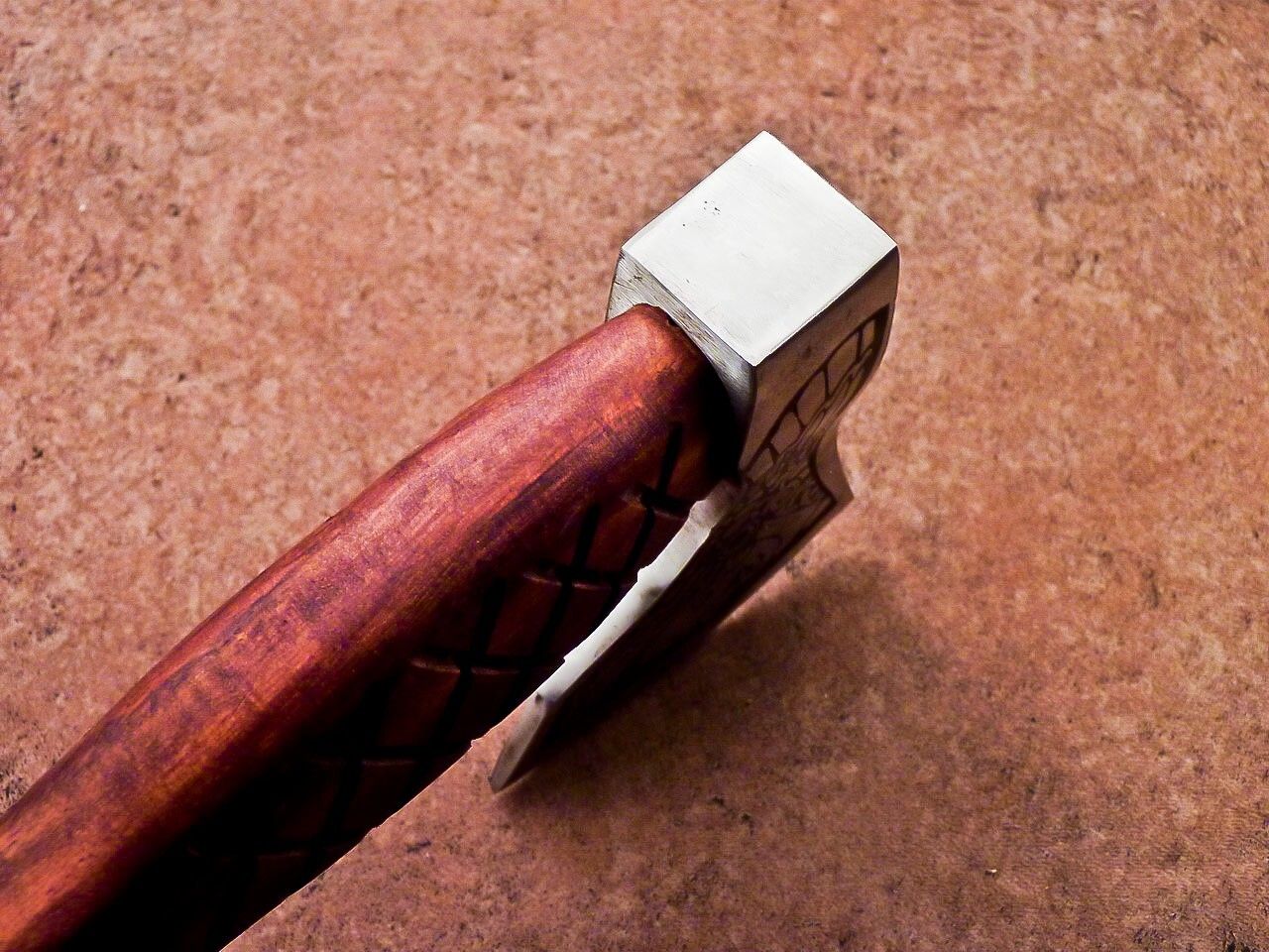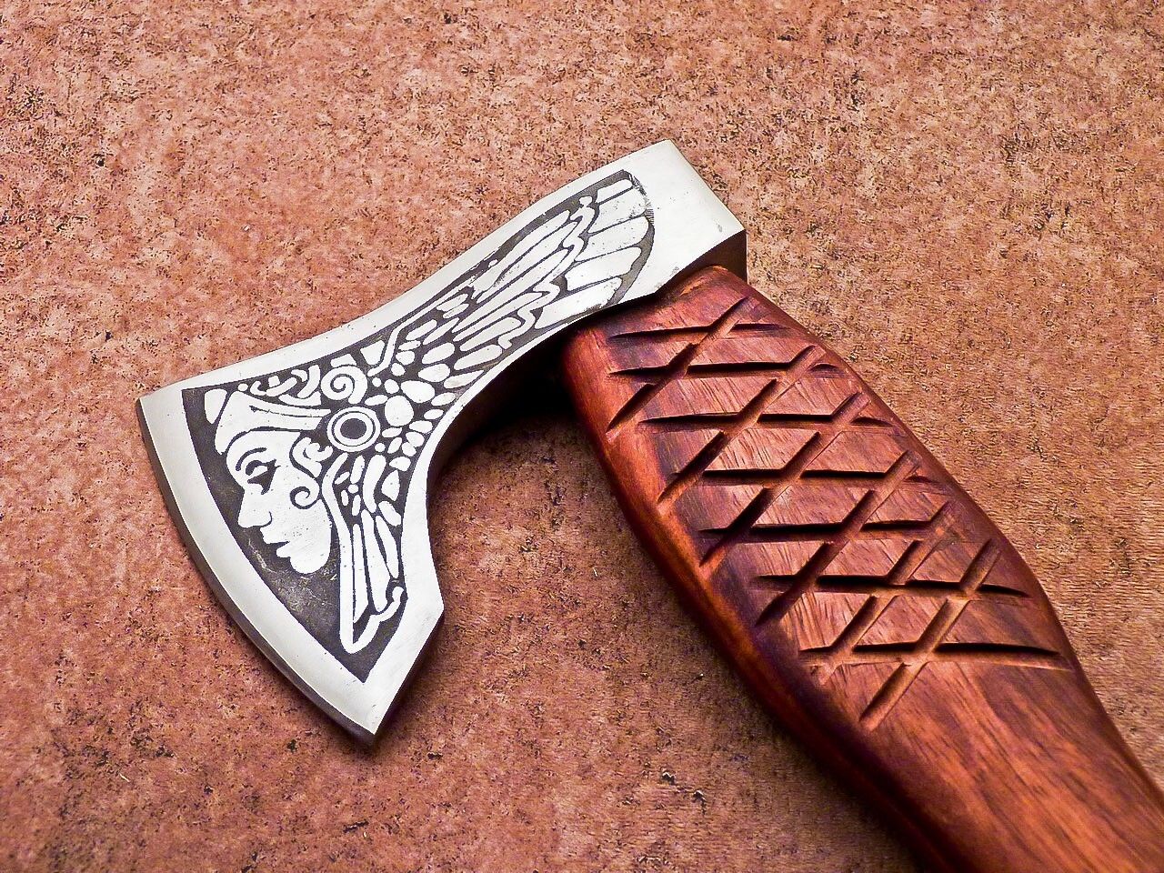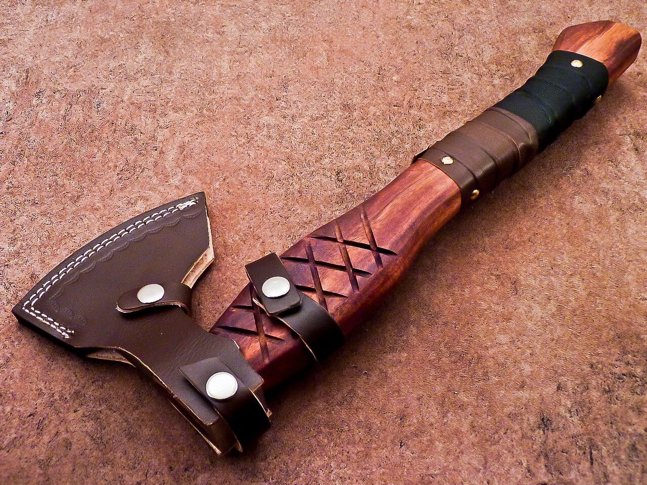 This Bearded Viking camping hatchet is a hand forged carbon steel axe, meticulously crafted for collectors, outdoor enthusiasts, and lovers of authentic Viking craftsmanship. Measuring 16 inches in overall length with a 4-inch cutting edge and a 5-inch blade width, it delivers precision, durability, and sharpness. The axe head is fully hand-forged and sharpened, featuring an antique patina that reflects traditional Viking artistry. The natural wood handle, bound with cowhide leather, ensures a secure and comfortable grip, enhancing control and balance during use. Each hatchet comes with a premium cowhide leather sheath with belt loop, providing safe storage and convenient transport. Ideal as a replica Viking axe, this bearded tomahawk is perfect for camping, outdoor activities, historical reenactments, or display in a collection. Proper care, including cleaning and occasional oiling, preserves the blade’s sharp edge and aesthetic appeal. This fully handcrafted axe combines artistic design with functional performance, making it a standout piece for any collection of Viking battle axes or outdoor gear enthusiasts.