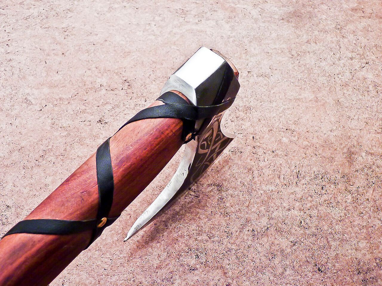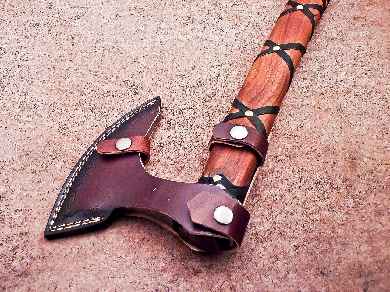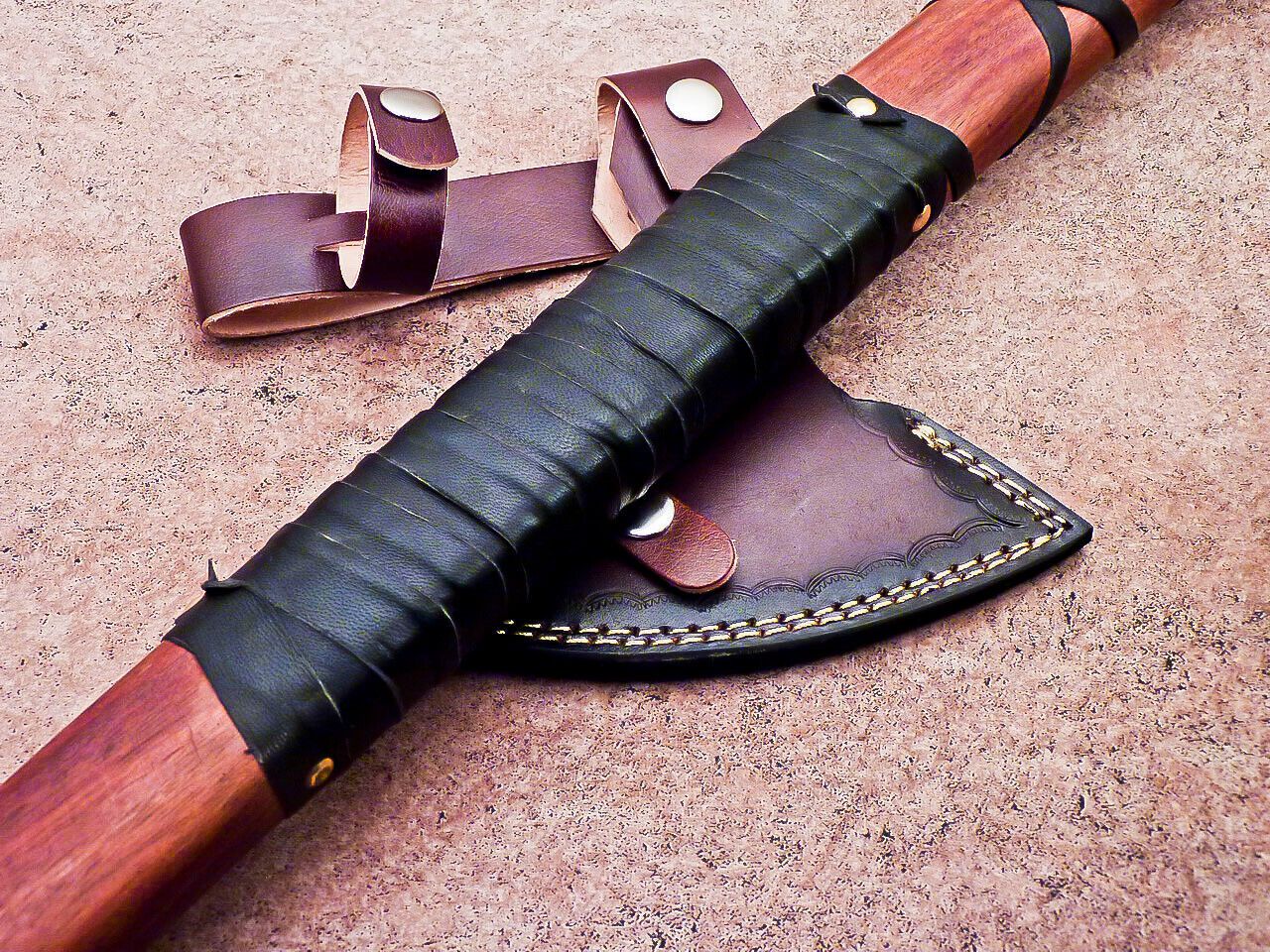 The handle is crafted from solid natural wood and wrapped with cowhide leather for a secure, comfortable grip. Each axe is individually handmade, ensuring that no two pieces are exactly alike. The engraved bearded head design reflects Viking heritage, giving it both functional strength and artistic beauty.