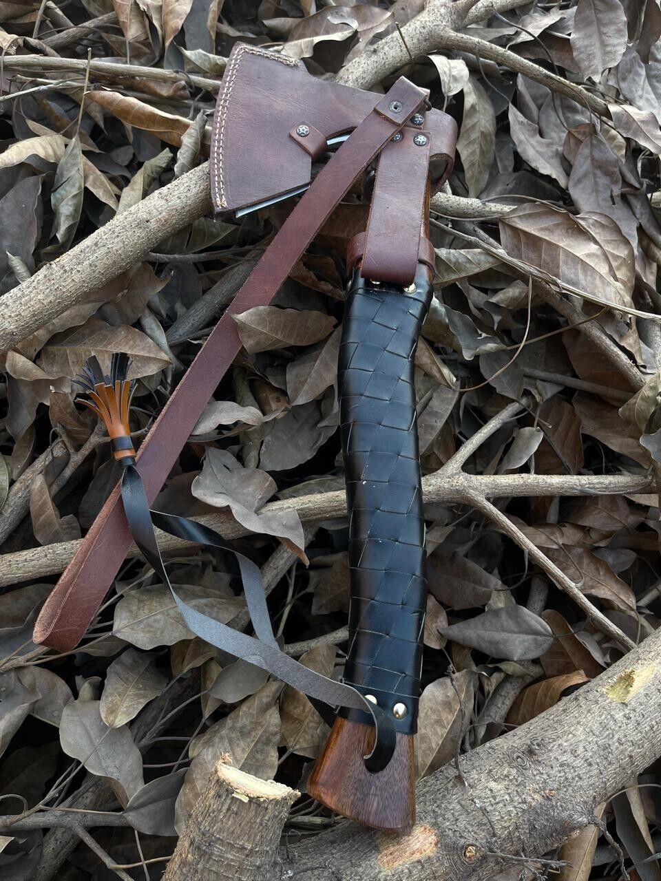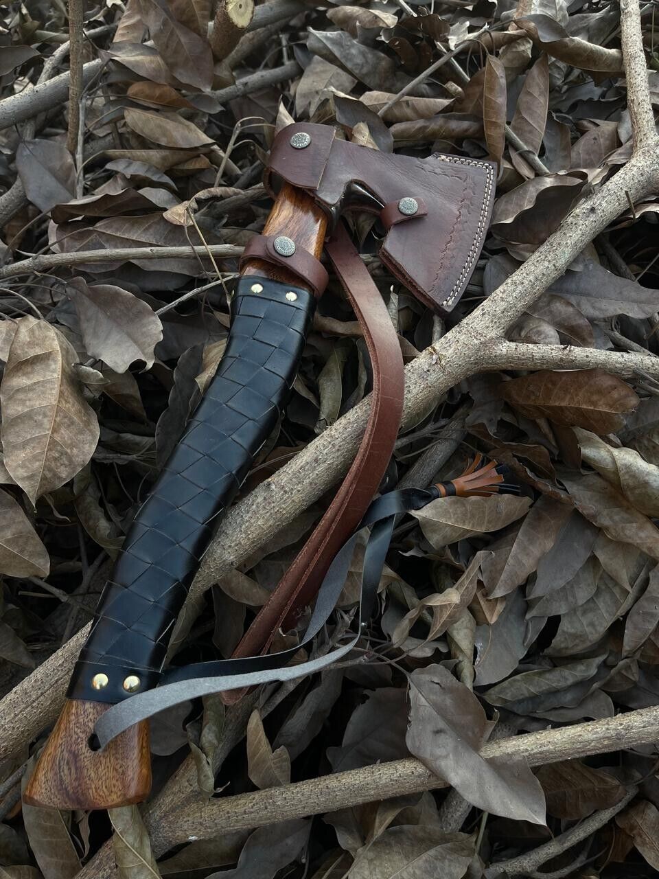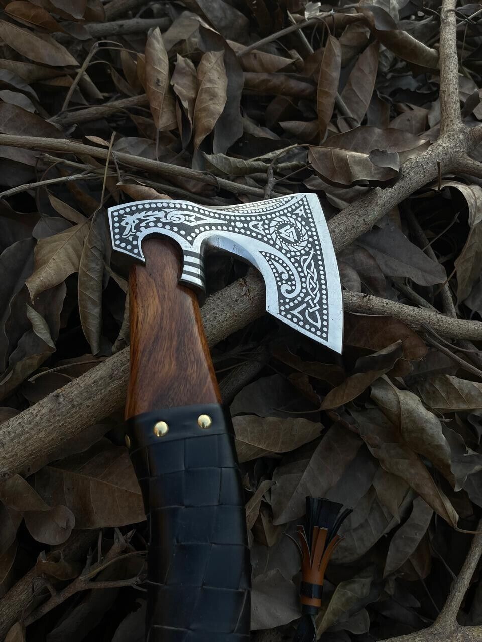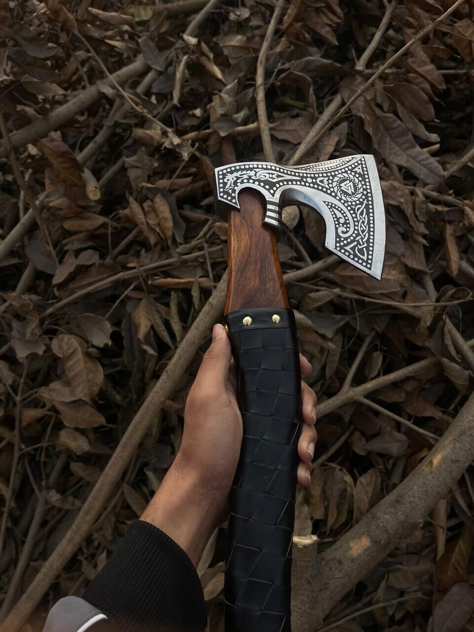 This handcrafted Viking axe is forged from premium high-carbon steel, featuring a sharp cutting edge with a temper hardness of 58-60 HRC. The handle is made from finely crafted ash wood, wrapped in durable leather for a secure and comfortable grip. Measuring 18 inches in overall length with a 5.3-inch cutting edge, this Viking axe is both functional and visually striking. Each piece comes with a high-quality leather sheath to protect the blade and allow safe transport. Perfect for collectors, outdoor enthusiasts, or as a unique gift, this axe can also be personalized with custom laser engraving on the handle or blade to create a truly one-of-a-kind item.