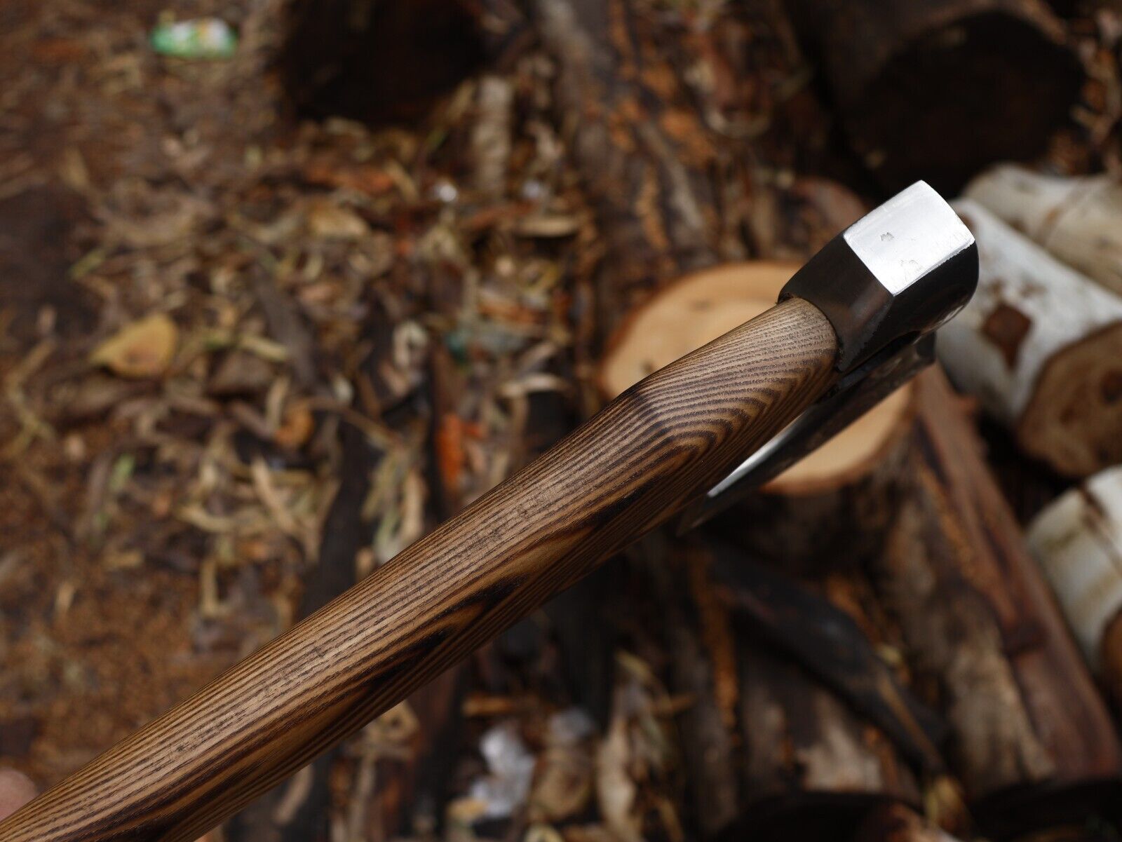This handmade Viking tomahawk axe is forged from high-quality carbon steel, delivering strength, durability, and striking historical appeal. With an overall length of 18 inches, a 4.5-inch cutting edge, and a 6.5-inch wide axe head, this hatchet is built for balance and performance. The ash wood handle, carefully shaped and polished, offers a secure and comfortable grip, making it perfect for use in outdoor tasks such as chopping, hunting, camping, and throwing.