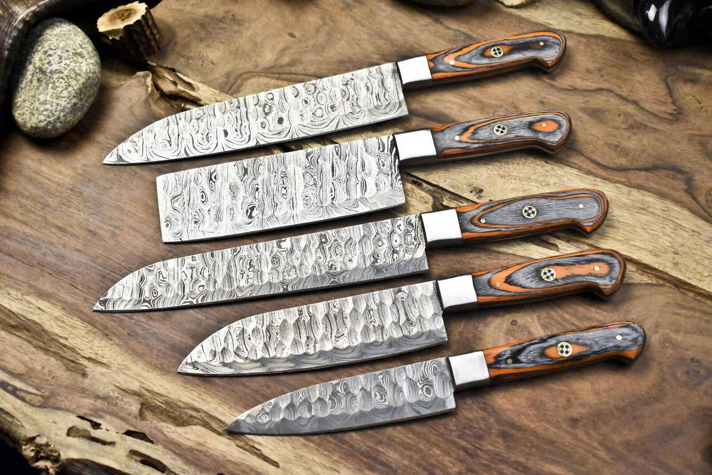 This 5-piece Hand Forged Chef Knife Set is crafted with precision and durability in mind, featuring stunning twist-pattern Damascus steel blades paired with elegant hardwood handles. Each knife is designed for multipurpose kitchen use, with an overall length of approximately 12 inches, a 7-inch razor-sharp blade, and a 5-inch comfortable handle. The blades are oil tempered to 58–60 HRC, ensuring long-lasting sharpness, strength, and excellent edge retention. Made from a blend of 1095 and 15N20 steel, the Damascus pattern is achieved by repeatedly folding the metals, resulting in a breathtaking swirl design that symbolizes motion and strength. These knives are not only practical for professional chefs and home cooking enthusiasts but also serve as exquisite decorative collectibles for display. With a solid steel bolster for added balance and hardwood handles for a natural grip, this set combines beauty, durability, and functionality, making it a must-have addition to any kitchen or collection.