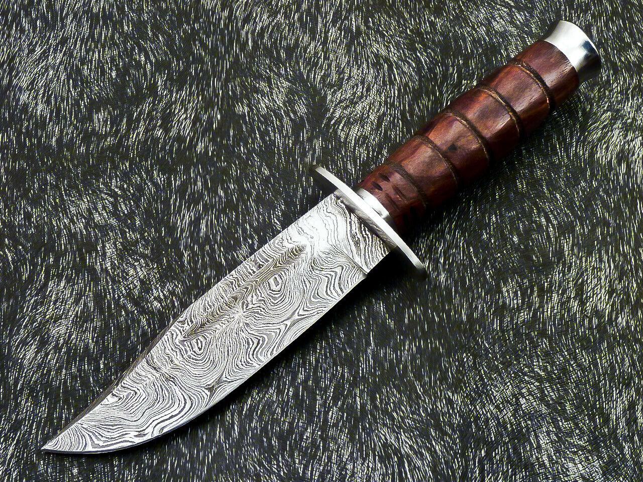 Hand Forged Damascus 9" Bowie Hunting Knife – Natural Wood Handle
