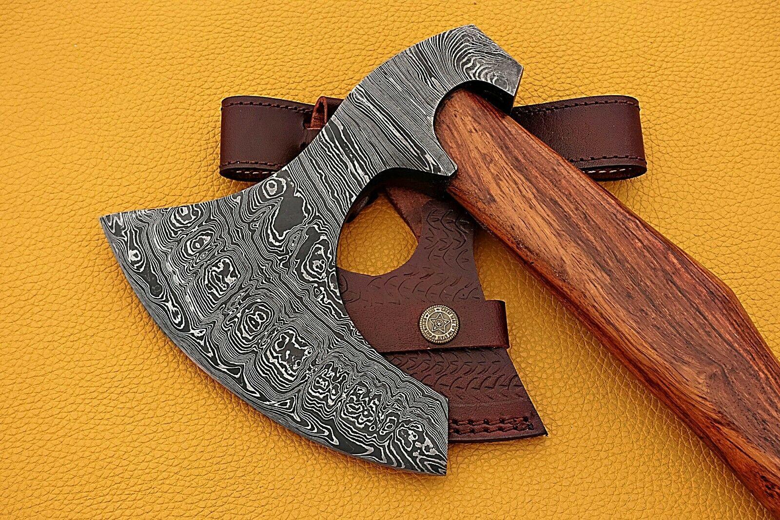 Hand Forged Damascus Rose Wood Tomahawk Axe Hatchet with Leather Sheath