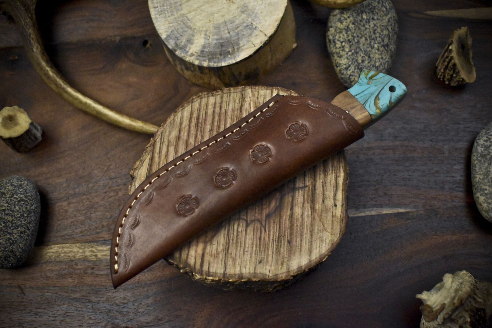 This handcrafted Damascus Skinner Knife is a premium hunting tool designed for precision, durability, and style. Measuring approximately 9.0 inches overall with a 4.5-inch blade and a 4.5-inch handle, it is perfectly balanced for controlled skinning and outdoor use. The blade is a Damascus acid etched fixed skinner knife, forged from 1095 and 15N20 high-carbon steels, folded repeatedly to create over 200 striking layers. The twist pattern features deep blacks and bright silvers, adding a bold, artistic touch. This Damascus knife custom handmade fixed blade hunting knife skinner includes a razor-sharp edge and a gut hook, making field dressing deer, elk, and other large game fast and efficient. The handle is crafted from premium walnut wood with a micarta bolster for enhanced grip and comfort during long use. Oil tempered to 58–60 HRC, the blade ensures long-lasting sharpness and toughness. Every Damascus skinner hunting knife comes with a hand-tooled leather sheath for safe storage and convenient carry. Whether you are searching for a Damascus skinner knife for sale or a collector’s masterpiece, this walnut Damascus skinner knife is a functional work of art, proudly handmade in Pakistan using traditional forging methods.