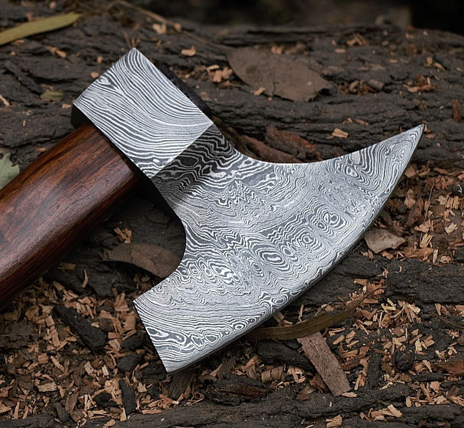 This handmade Damascus steel axe combines traditional craftsmanship with modern functionality. Featuring a bearded goosewing Damascus axe head forged from 352 layers of high-carbon 1095 and 15N20 steel, this tool delivers exceptional durability, edge retention, and striking visual patterns. The broad hewing axe design ensures powerful, precise cuts, making it perfect for woodworking, bushcraft, camping, and outdoor adventures.