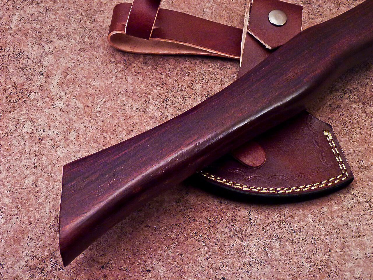 The 15.5-inch handle is made from natural wood, providing a comfortable, sturdy grip that enhances control and precision. Each axe comes with a custom handmade leather sheath, ensuring both protection and convenience for carrying in the outdoors. The blade has undergone excellent heat treatment, achieving a Rockwell hardness of 50–54 at the edge and 42–45 along the spine, making it an effective and reliable tool for heavy-duty tasks.