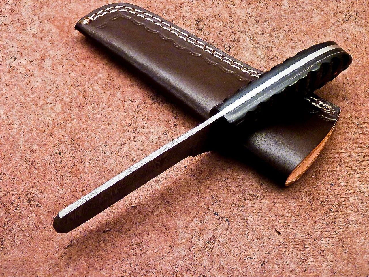 This damascus steel bull cutter knife is handmade and hand forged for durability and traditional cowboy performance. Designed as a cowboy bull cutter knife, it delivers balance and precision for field and outdoor tasks. With an overall length of 8 inches, this custom bull cutter knife offers a compact yet powerful design. Built for reliability, it stands among high quality bull cutter knives suitable for hunting and survival use.