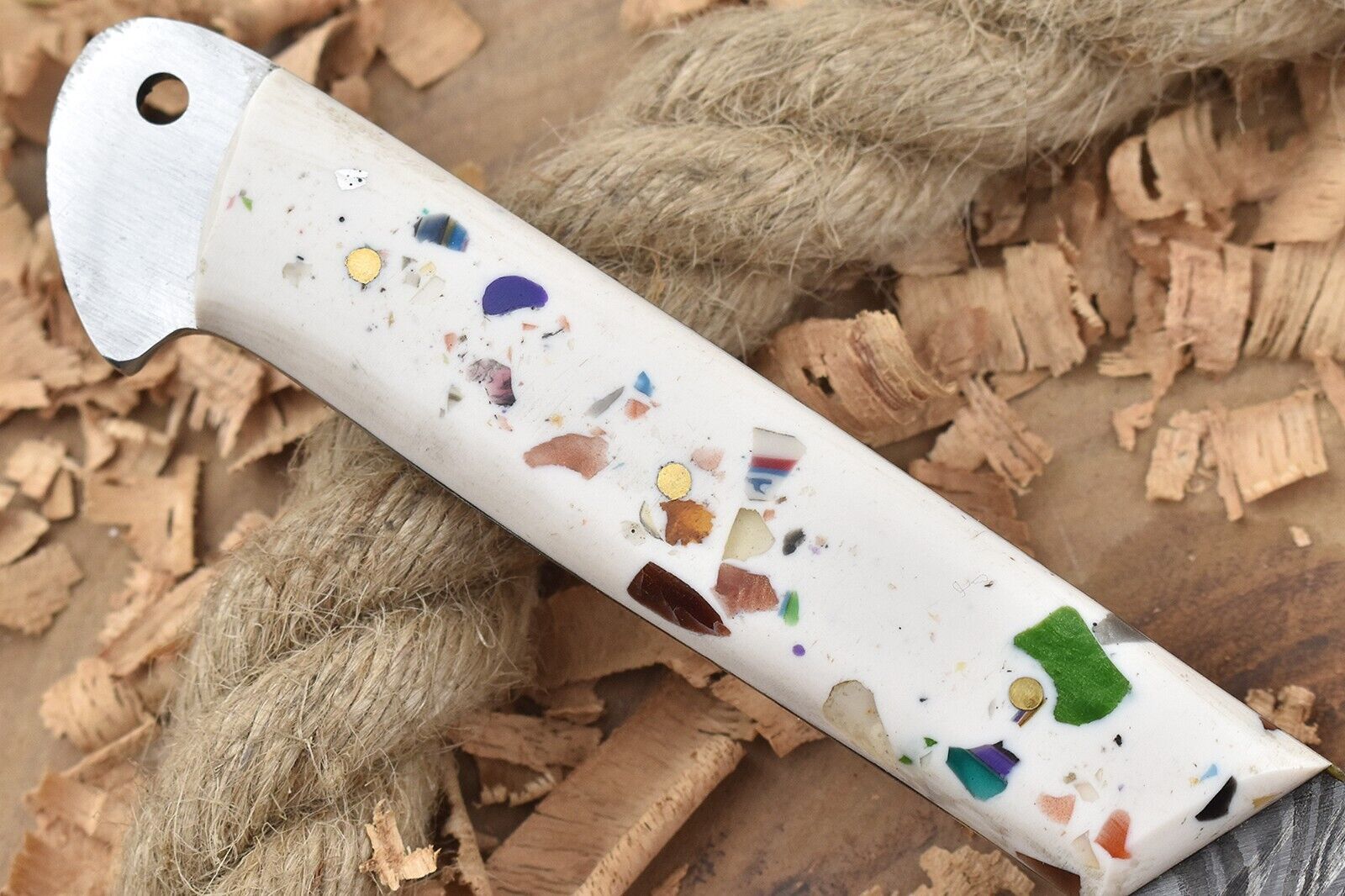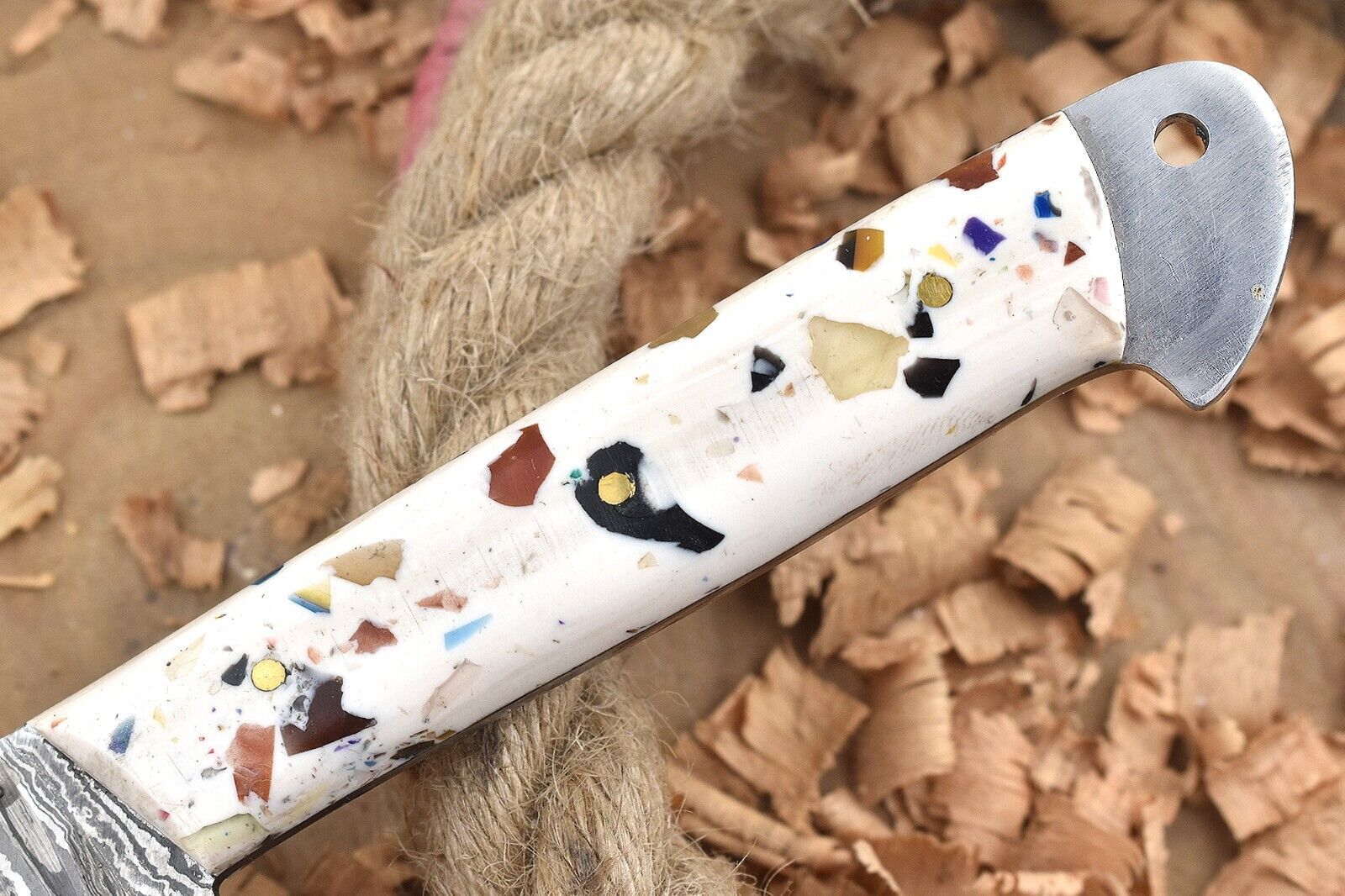 This Custom Handmade Forged Damascus Steel Kitchen Chef Knife is a masterpiece of craftsmanship, designed for both professional chefs and cooking enthusiasts. Each knife is meticulously hand forged, offering a perfect blend of strength, sharpness, and beauty. The unique White Stone Resin Thappa Cleaver handle not only enhances the aesthetic appeal but also provides a comfortable and secure grip for precision cutting. Whether used in the kitchen or outdoors, this knife is a reliable and stylish tool that will last for years.