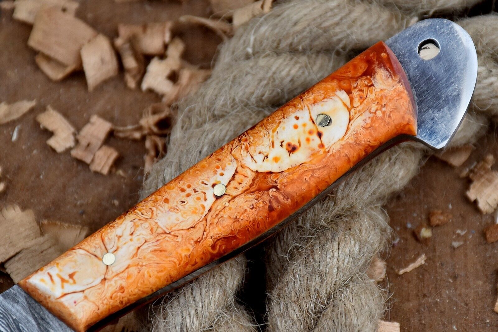 This custom handmade forged Damascus steel kitchen chef knife is designed with precision and durability in mind. With an overall length of 9 inches, it features a sharp 5-inch blade and a 4-inch handle, crafted from a stunning combination of pink and white resin sheets in an open tang design for a comfortable grip. The blade has an approximate thickness of 4 mm, ensuring strength and long-lasting performance. A premium quality thick leather sheath is included, which can be easily worn on a belt for convenience and protection. Our blades are made from high-quality Damascus steel, offering excellent edge retention, sharpness, and resilience. We also craft knives in a variety of steels including high carbon steel, 1095, 440C, J2 steel, D2 tool steel, Baring steel, Spring steel, and ATS 34 stainless steel. Every knife is custom-made with attention to detail, making it not only a reliable tool but also a collector’s item. Whether for professional chefs, cooking enthusiasts, or collectors, this knife is a perfect blend of performance and craftsmanship. Custom orders are welcome, allowing you to choose the exact design, features, and accessories that suit your needs.