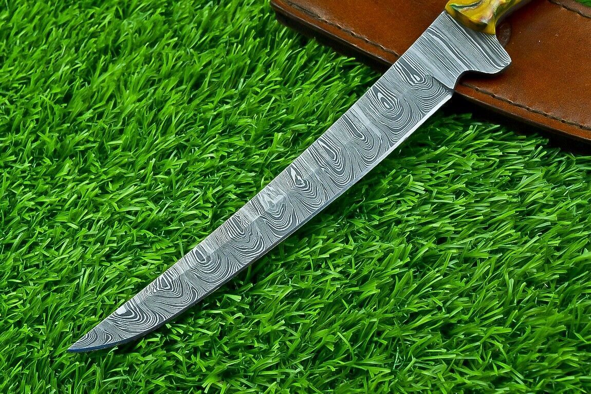 Hand Forged Damascus Steel Fillet Knife – Chef, Kitchen, Hunting & Camping Knife with Resin & Natural Wood Handle