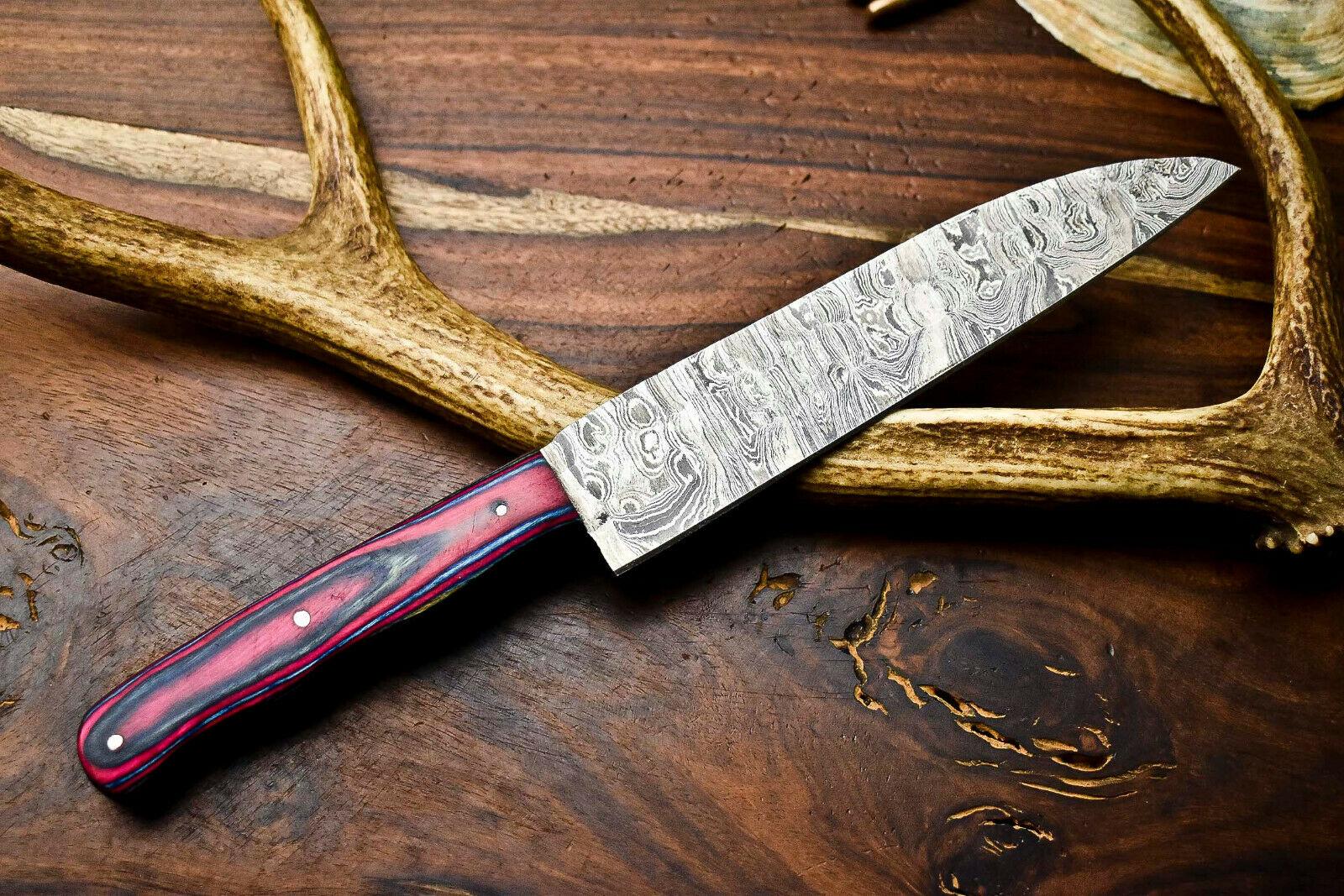 Handmade Damascus steel chef knife is a true blend of tradition, craftsmanship, and functionality. This full tang kitchen knife is forged from 1095 high carbon steel and 15N20 nickel steel, folded over and over to create 384 striking layers. Unlike ordinary acid-etched imitations, our Damascus pattern is real, formed through expert forging and acid treatment that reveals the beautiful contrast of nickel’s satin color and the dark gray of high carbon steel. The result is a stunning, durable, and razor-sharp blade designed for everyday kitchen use. Each knife is carefully hand-polished to enhance its beauty and sharpened to a fine cutting edge for precise performance. The handle is equally well-crafted, polished to a smooth finish for comfort, grip, and balance, making it a reliable tool for professional chefs and home cooks alike. Every step of production is performed by hand without CNC machining, ensuring every knife is unique and truly one-of-a-kind. Built to last, this Damascus chef knife is not only a powerful kitchen tool but also a timeless piece of cutlery art. Perfect for slicing, chopping, and dicing, it brings strength, style, and efficiency to your cooking experience.